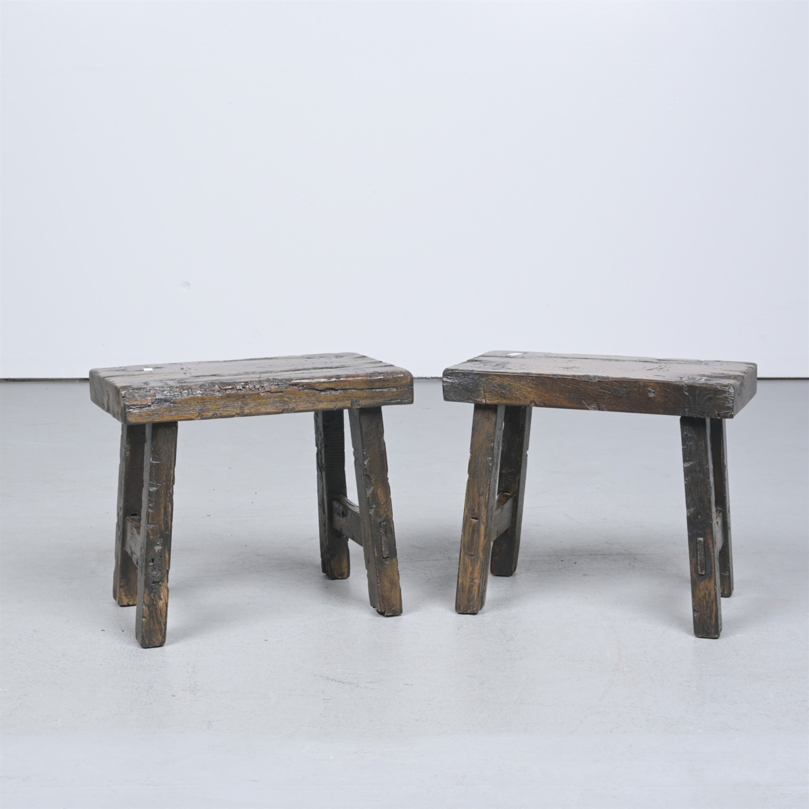 A PAIR OF OAK STOOLS IN 18th CENTURY PROVINCIAL STYLE (35CM H X 41CM W X 24CM D)