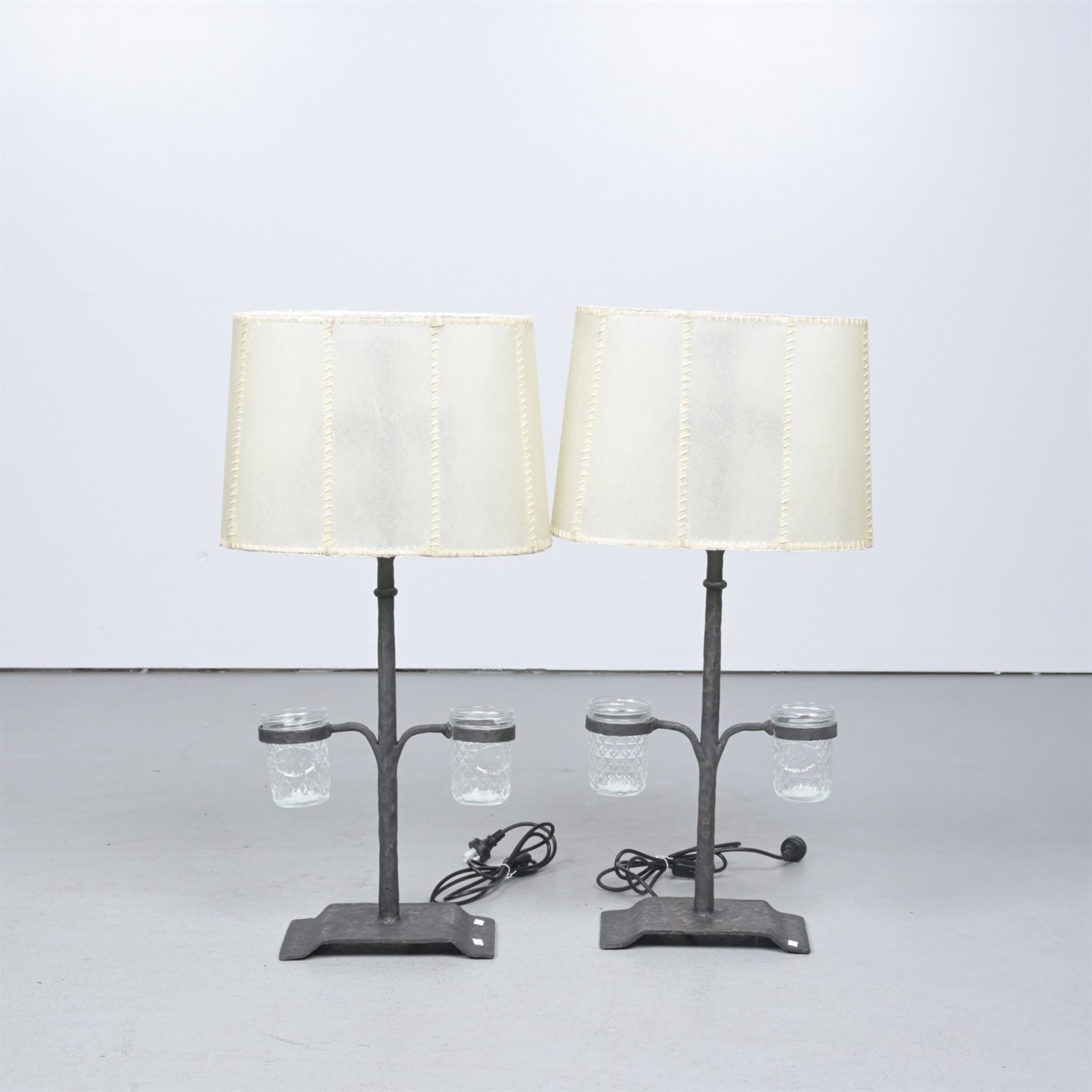 A PAIR OF WROUGHT IRON GOURLAY-STYLE TABLE LAMPS (82CM H X 42CM W)