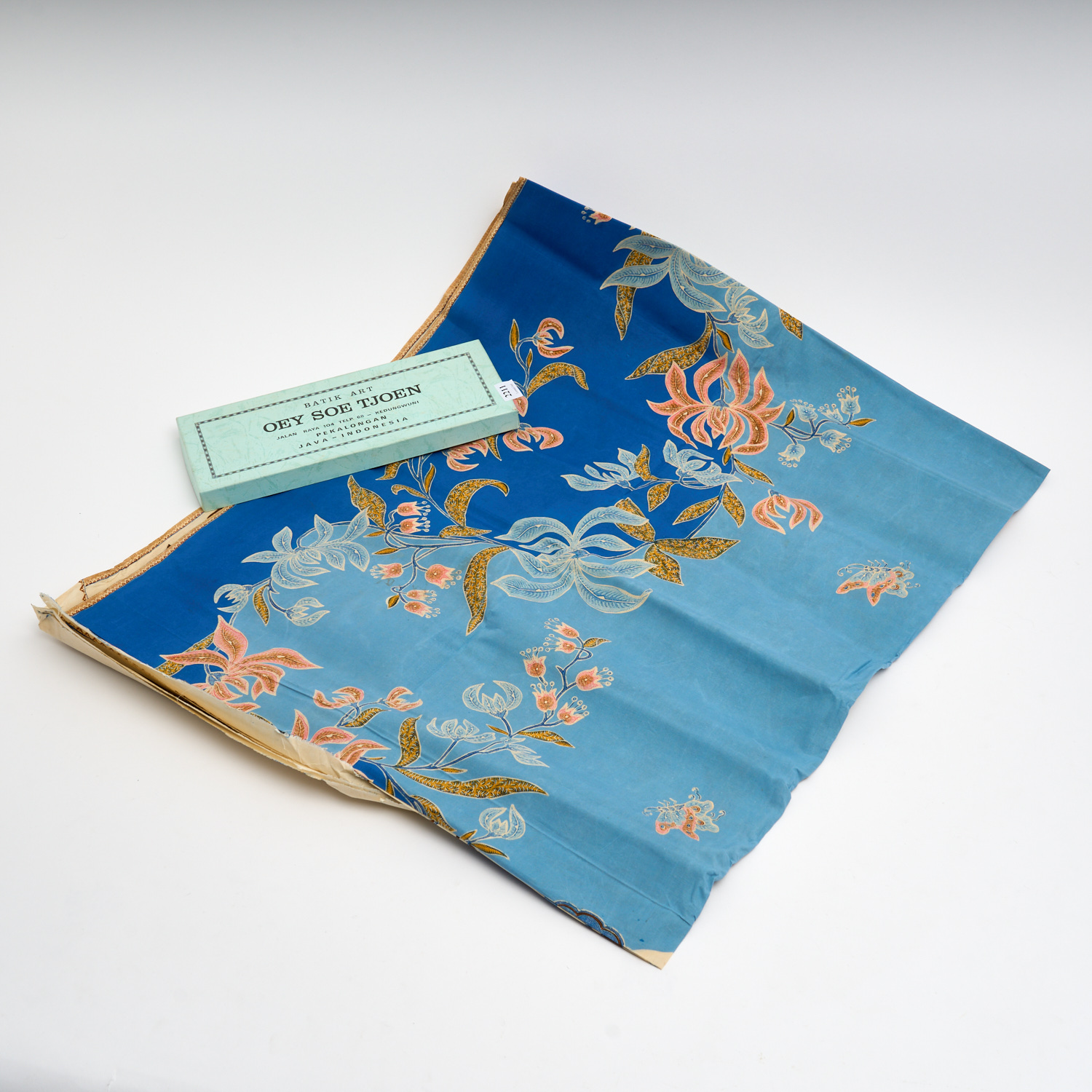 A MUSEUM QUALITY INDONESIAN BATIK BY OEY SOE TJOEN (1901-1975), (BLUE AND CORAL PATTERN) 299G 1M X 2.55M, SIGNED/STAMPED (TEXTILE HAS A SMALL MARK)