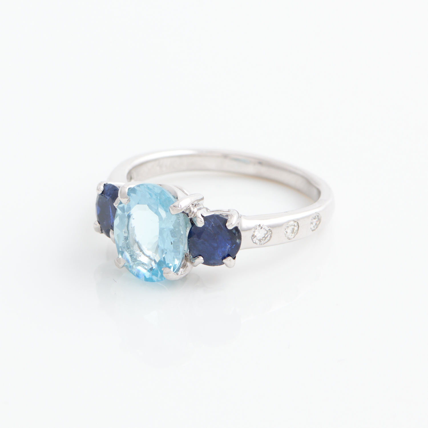 AN AQUAMARINE, SAPPHIRE AND DIAMOND RING IN 18CT WHITE GOLD, SIZE M, 4.3GMS