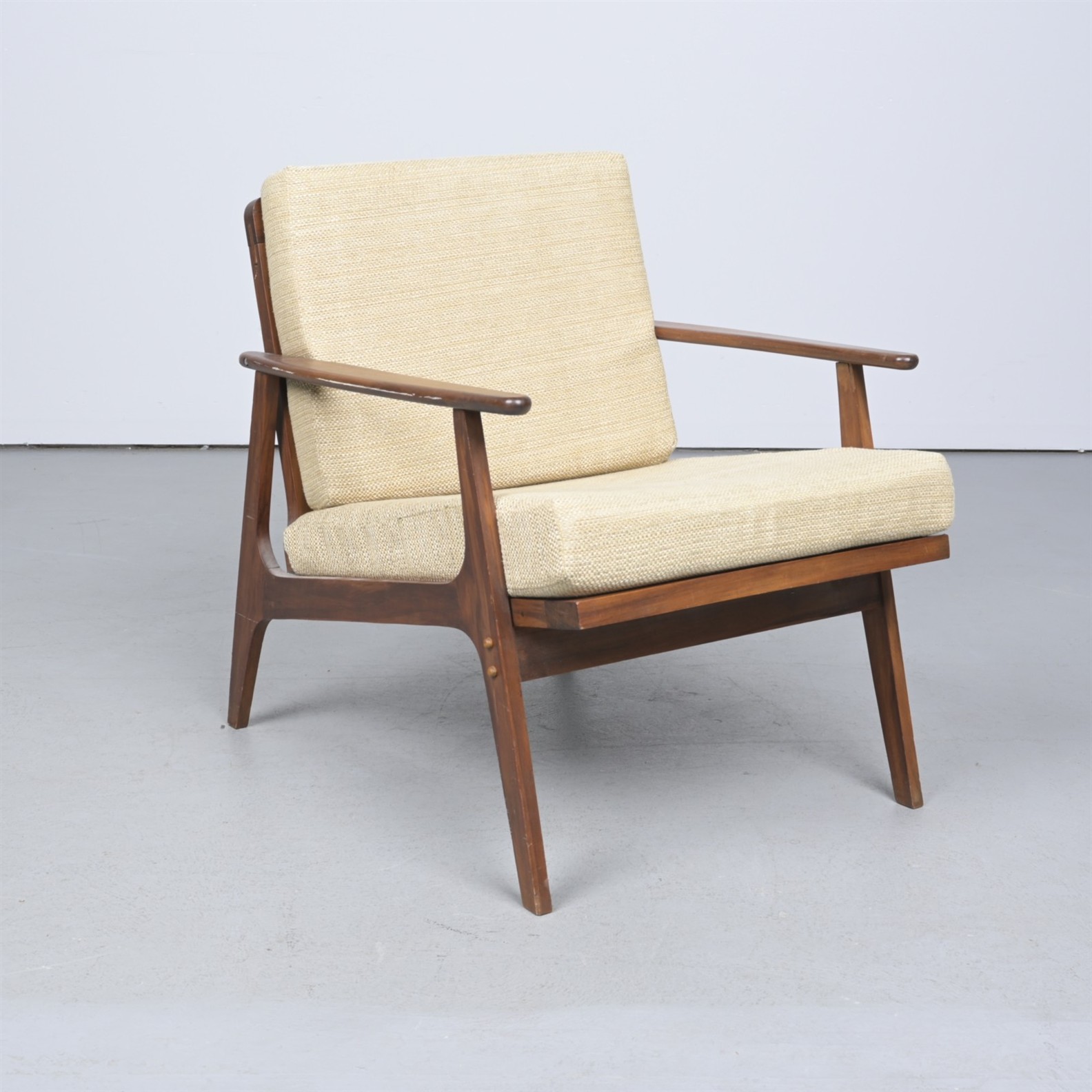 A MID-20th CENTURY TEAK AND UPHOLSTERED ARMCHAIR (A/F) (81CM H X 64CM W X 81CM D)