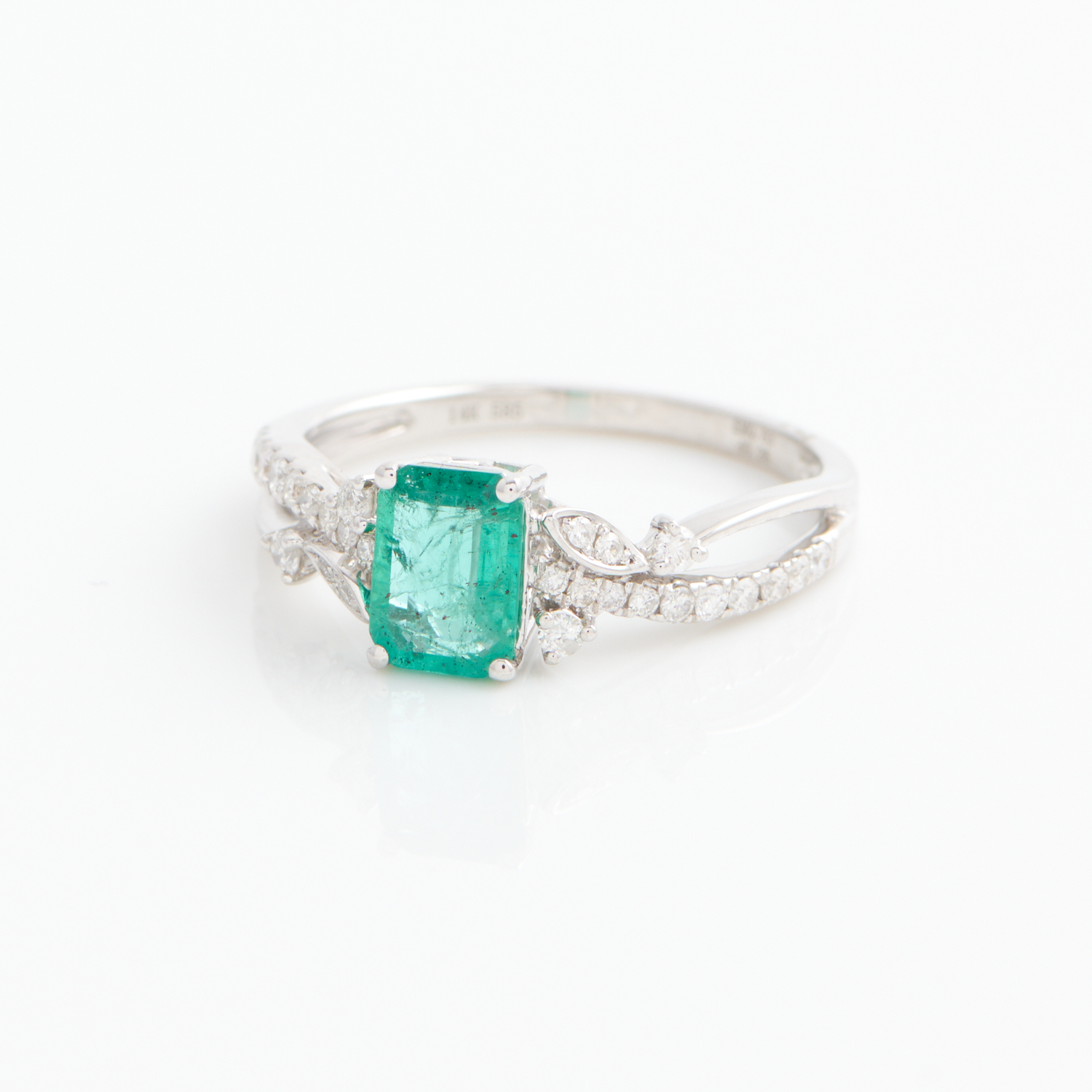 AN EMERALD AND DIAMOND RING IN 14CT WHITE GOLD, THE EMERALD WEIGHING APPROXIMATELY 0.83CT, SIZE O, 2.4GMS