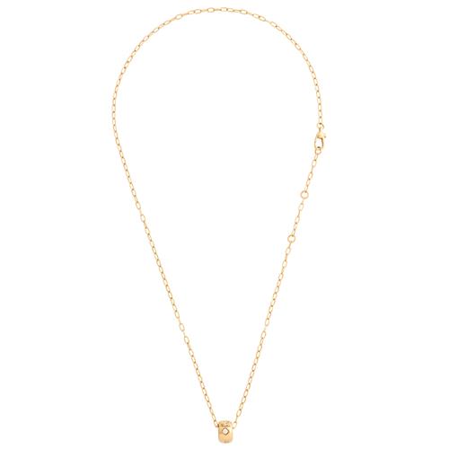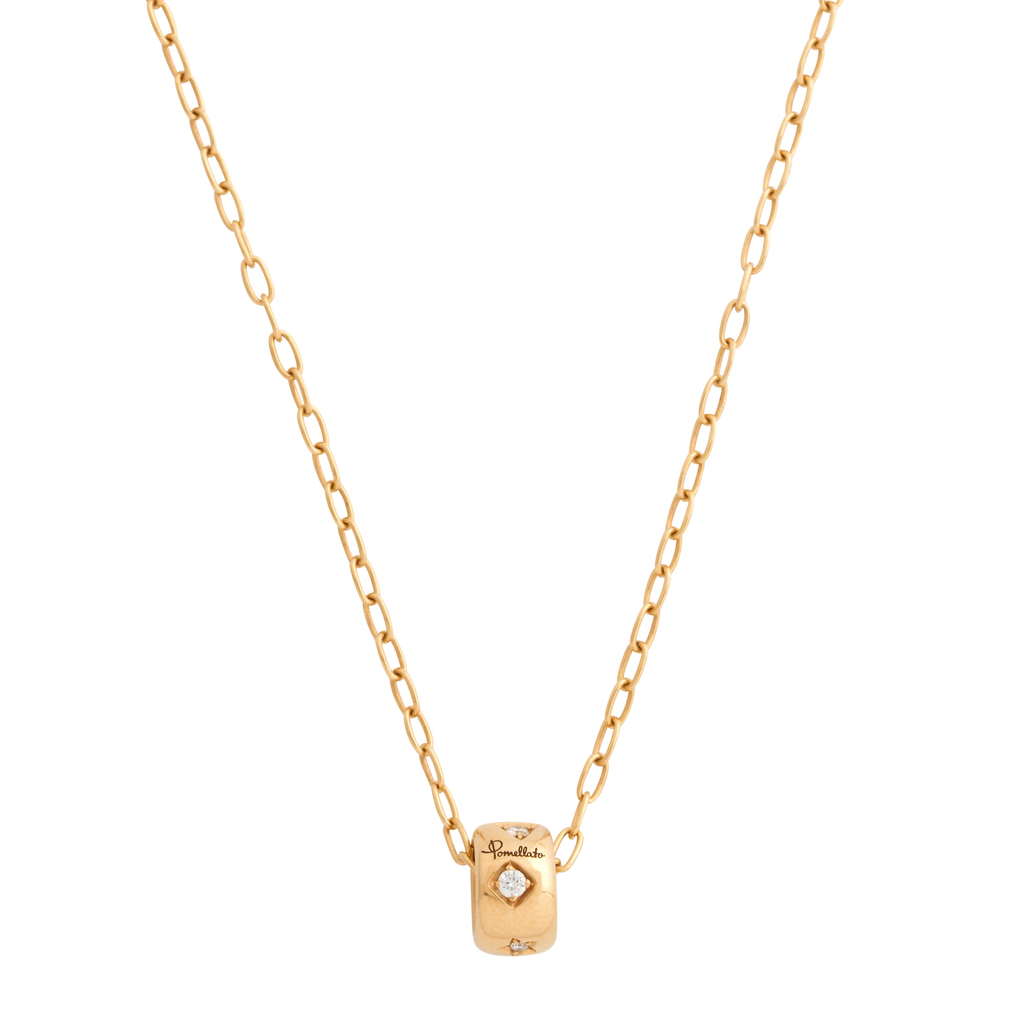 Featuring a rondelle pendant claw-set with round brilliant-cut diamonds in star, square and triangular shaped settings, suspended from a cable link chain completed by a parrot clasp, signed Pomellato, length 400mm to 440mm (adjustable), gross weight approximately 7.8 grams.
