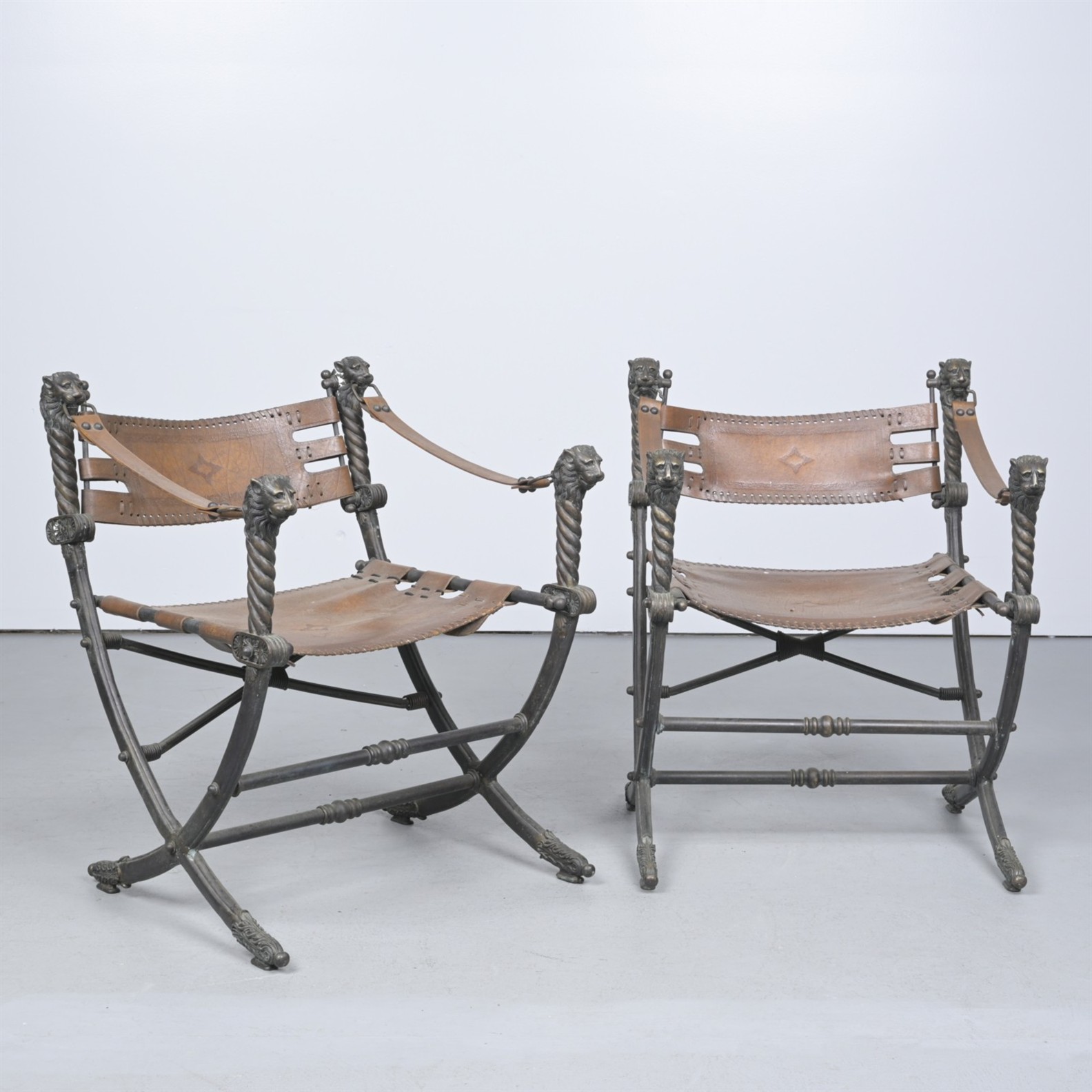 A PAIR OF ANTIQUE-STYLE METAL-FRAMED CURULE CHAIRS, WITH LEATHER BACKS AND SEATS (87CM H X 67CM W X 72CM D) (THIS ITEM MUST BE REMOVED BY PROFESSIONAL CARRIERS OR CLIENTS. LEONARD JOEL STAFF CANNOT ASSIST WITH CARRYING OR DELIVERY OF THIS ITEM)