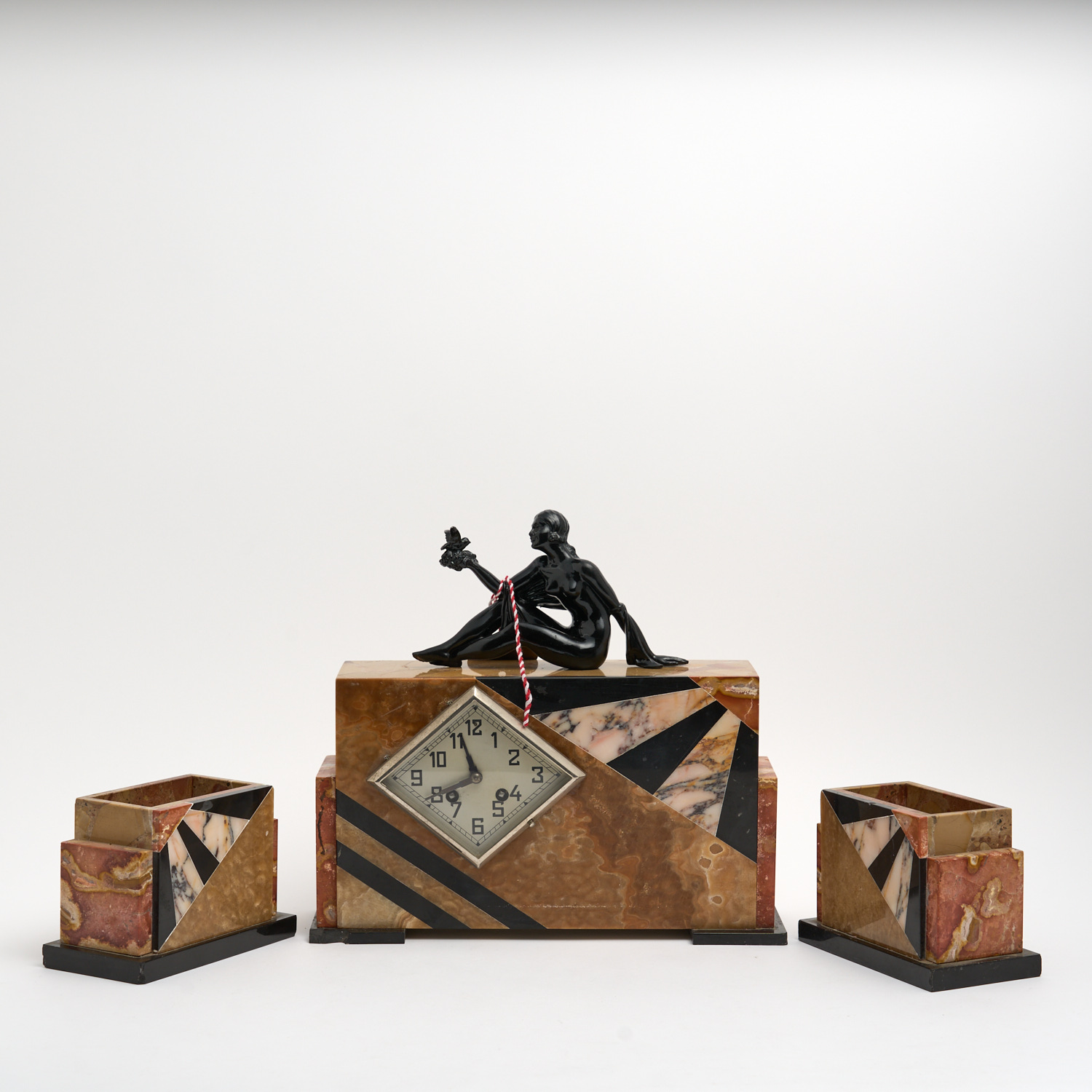 AN ART DECO SPECIMEN MARBLE CLOCK GARNITURE WITH ENAMELED SPELTER FIGURE (WITH KEY) (A/F) H.32CM