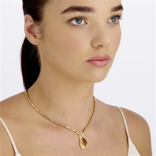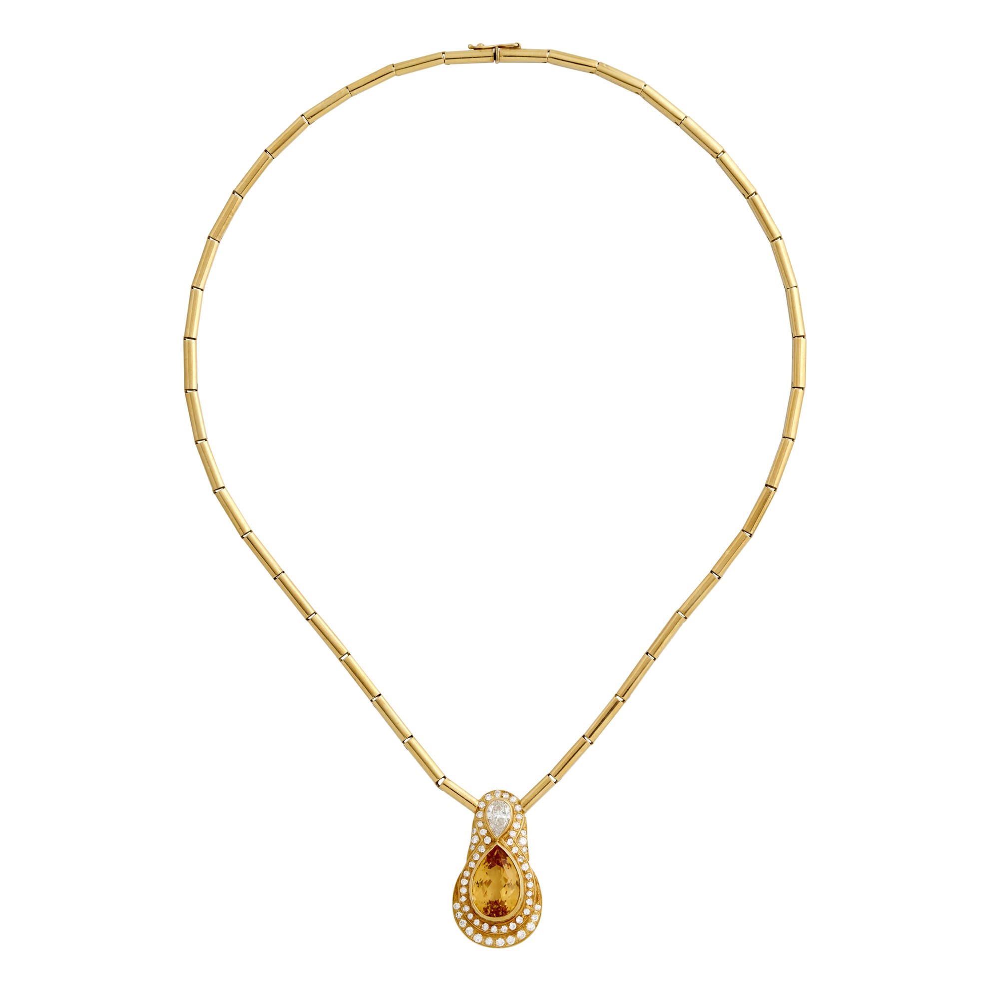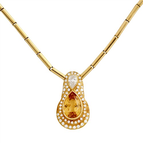 Centring a bezel-set pear shaped citrine, inverted to a bezel-set modified brilliant-cut pear-cut diamond of approximately 0.85 carats, surrounded by two tiers of claw-set round brilliant-cut diamonds on a tubular link necklace to a clasp and clip, pendant length approximately 35mm, necklace length approximately 460mm, gross weight approximately 32.0 grams.