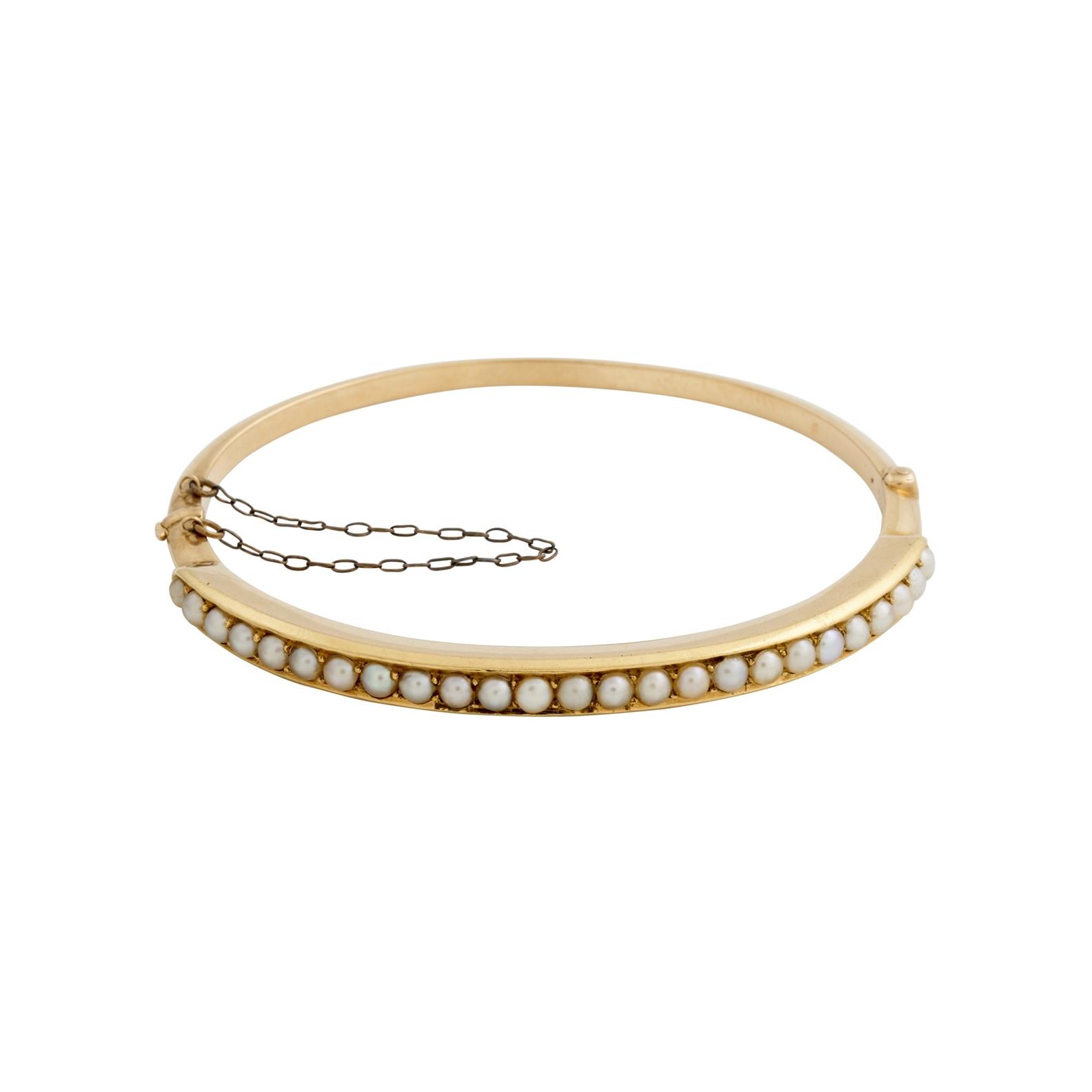The oval hinge bangle is claw-set to the front with a line of seed pearls, mounted in 15ct gold, inner circumference 160mm, gross weight approximately 10.3 grams.