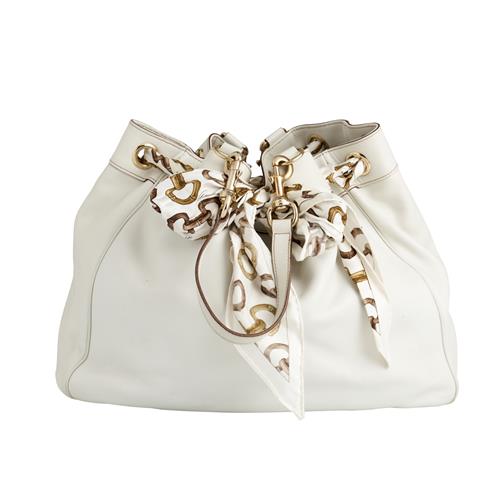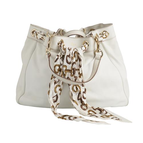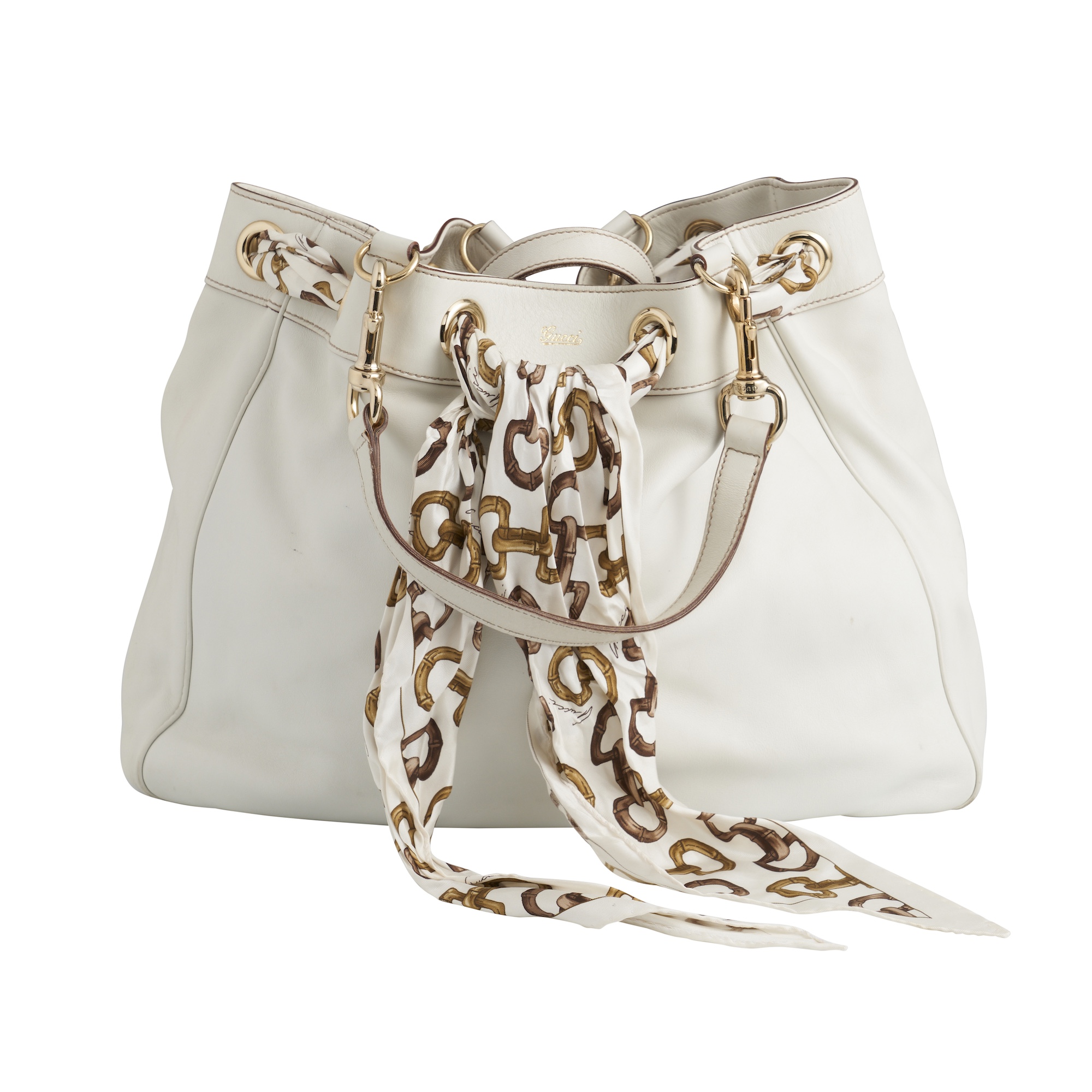 Styled in bone white leather with gold tone hardware, featuring woven silk scarf detail with horsebit print, measures 40 x 31 x 14 cm.