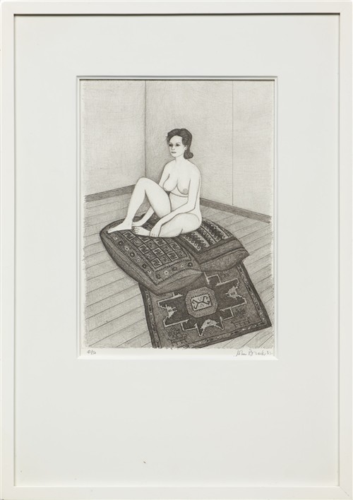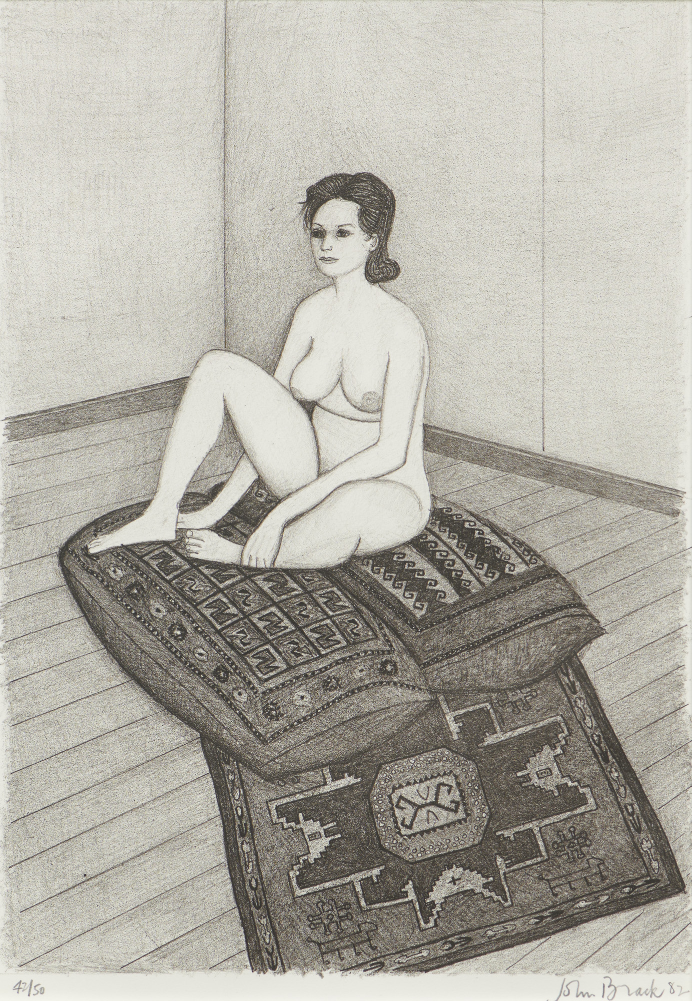 Nude Seated on Two Cushions and Patterned Rug 1982