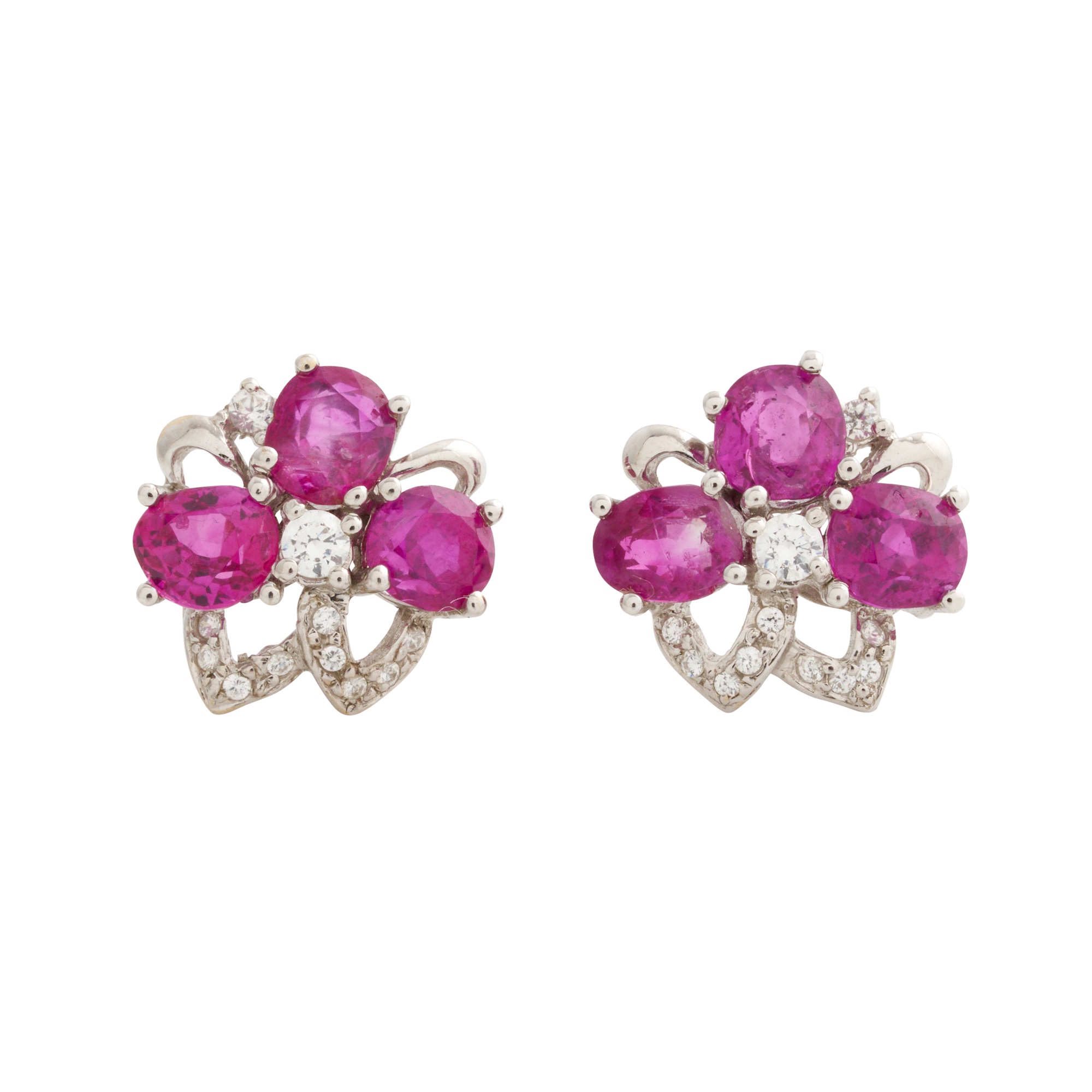 Each earring of floral cluster design, claw-set with three oval-cut rubies with round brilliant-cut diamond detail, the rubies together weighing approximately 4.68 carats, to post and butterfly fittings, diameter 16mm, gross weight approximately 4.9 grams.