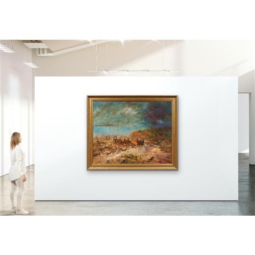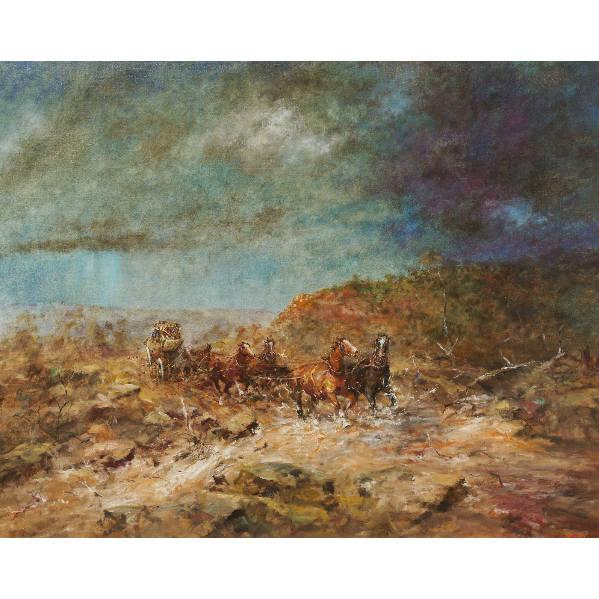 HUGH SAWREY (1923-1999) Running the Station Horses, Western Queensland oil on canvas 81.5 x 120cm