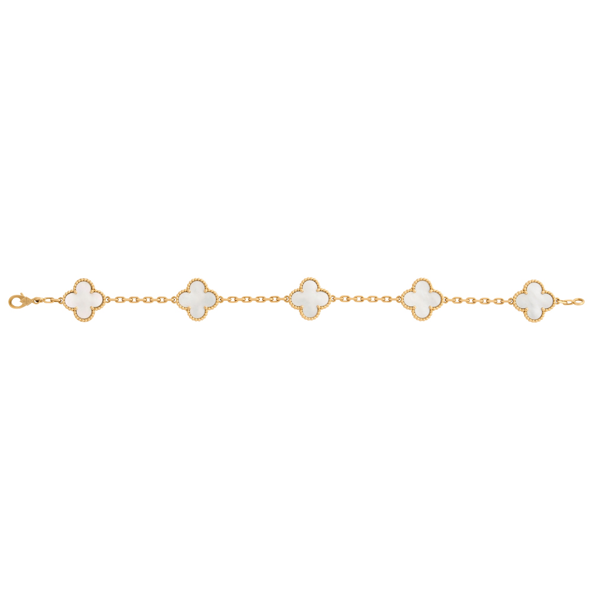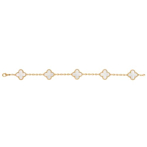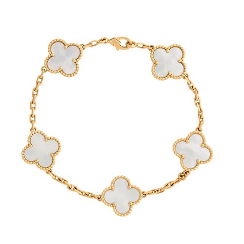 Modelled as a line of five mother-of-pearl quatrefoil motifs finished with beaded edging, to diamond cut trace chain connectors completed by a parrot clasp, signed VCA for Van Cleef & Arpels, length 190mm, gross weight approximately 12.0 grams.