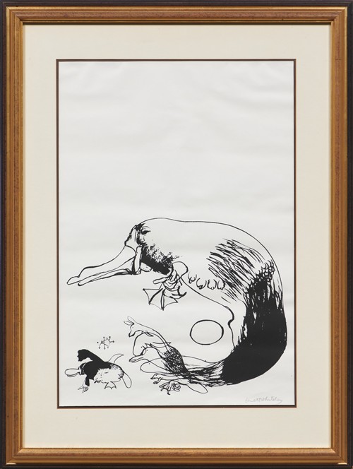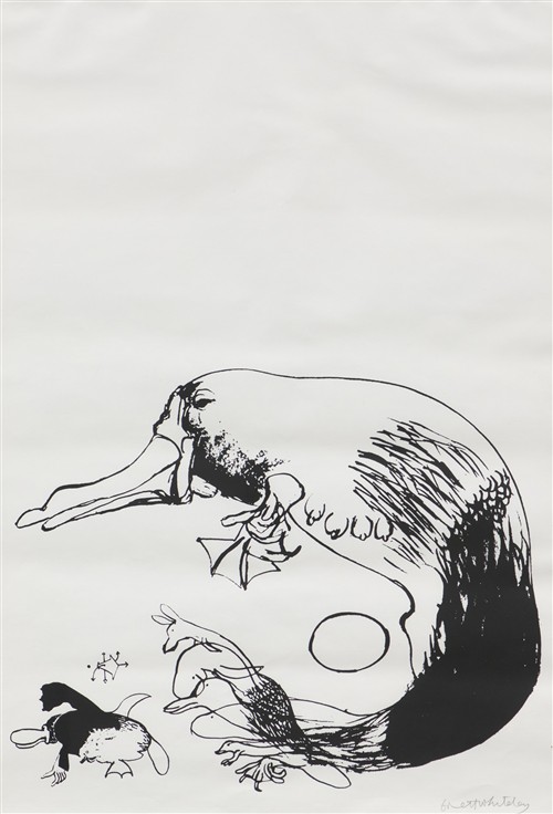 Brett Whiteley, Platypus 1970, charcoal, collage and applied feathers on paper, 72 x 53cm, Bonhams, Sydney, 19 November 2017, lot 1