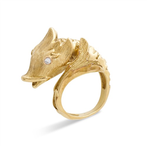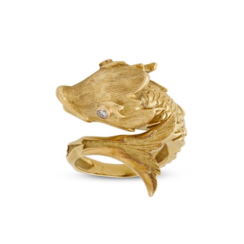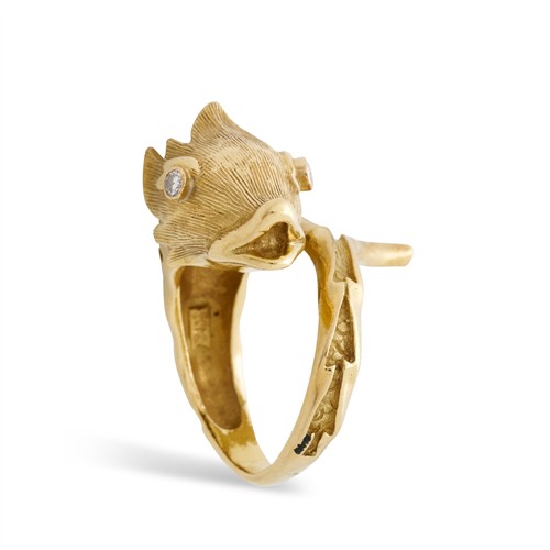 Modelled as a fish, its eyes collet-set with brilliant-cut diamonds, to a sculpted body and textured scales, the diamonds together weighing approximately 0.06 carats, mounted in 18ct gold, size O1/2, gross weight approximately 15.9 grams.