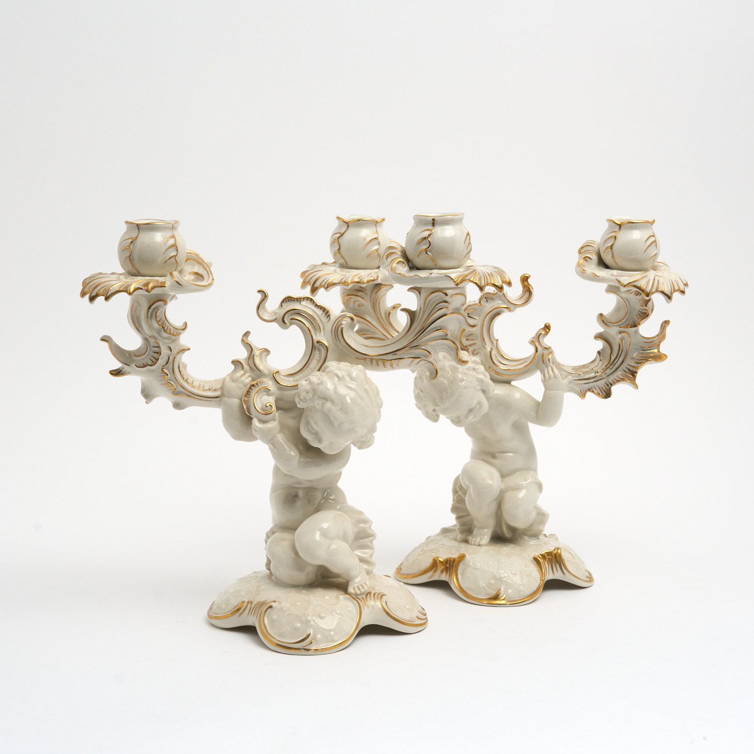 A PAIR OF HUTSCHENSREUTHER PORCELAIN CANDLE STICKS (A/F) H.27CM
