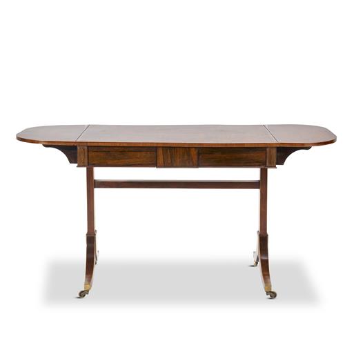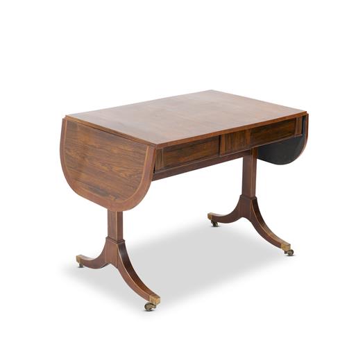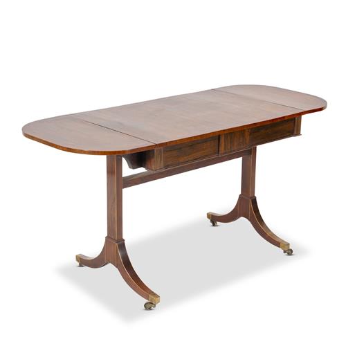 The rounded rectangular top above a pair of frieze drawers to the front and false drawer fronts to the reverse, on end standards with outswept feet and brass caps and casters, the top cross-banded, the top, frieze, and supports with inlaid with holly stringing