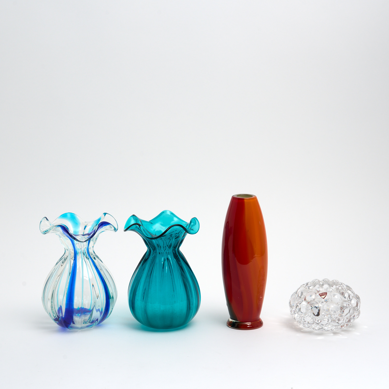 FOUR PIECES OF ART GLASS INCLUDING TWO FLUTED VASES, AN ORREFORS CANDLE HOLDER AND AN ART GLASS VASE IN ORANGE AND RED H.20CM (TALLEST)