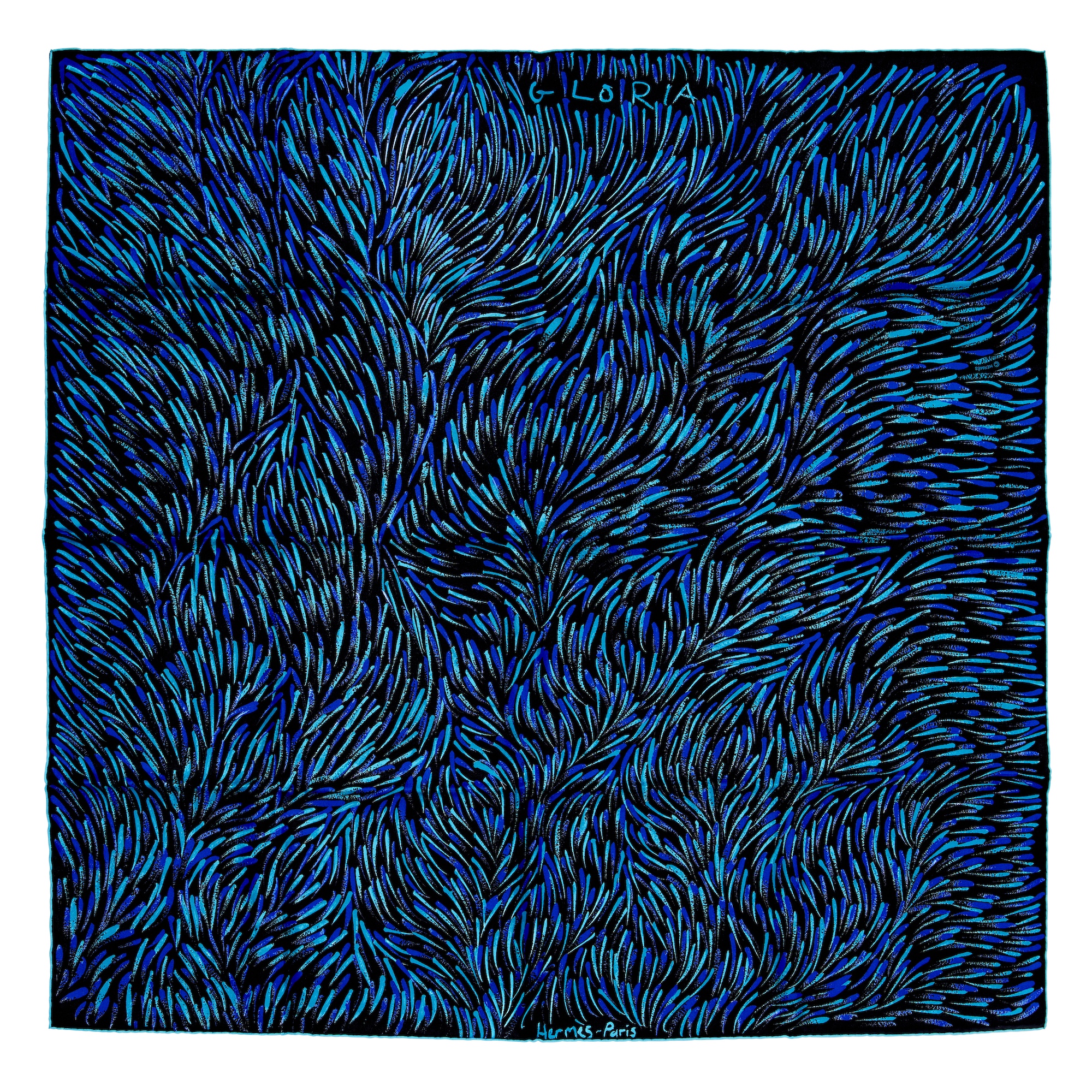 Design by Gloria Petyarre with an all over abstract brushstroke print in tones of cobalt, teal and black, measures 90 cm.