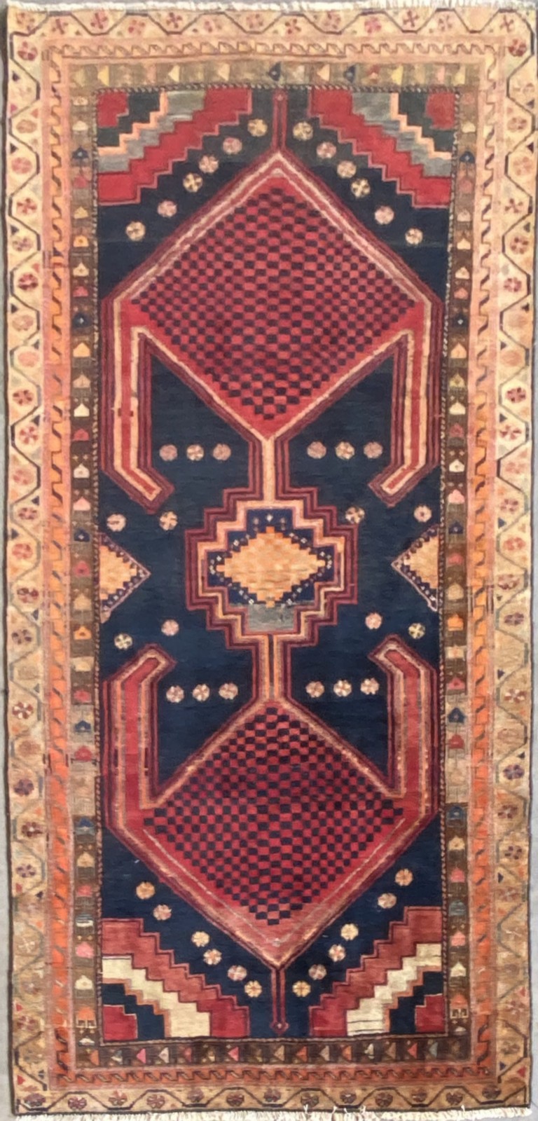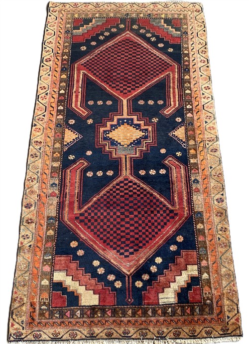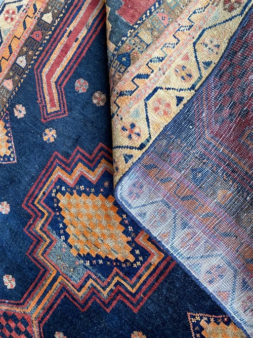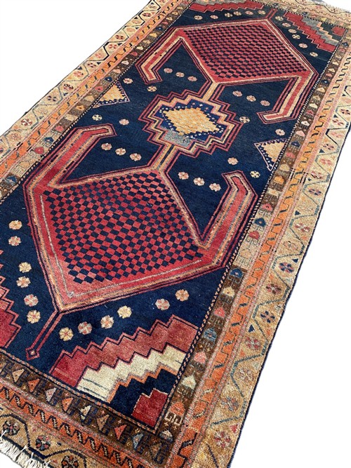 WOOL PILE & VEGETABLE DYES WITH NATURAL ABRASH COLOUR VARIATION. TRIBAL WEAVE FROM THE LORESTAN PROVINCE WITH TRIBAL DESIGN OF DOUBLE BOLD ANGULAR MEDALLIONS IN AN INDIGO FIELD OF SECONDARY FLORAL PATTERNS. TRIPLE MINOR BORDERS OF GEOMETRIC PATTERNS & FLOWER HEADS.