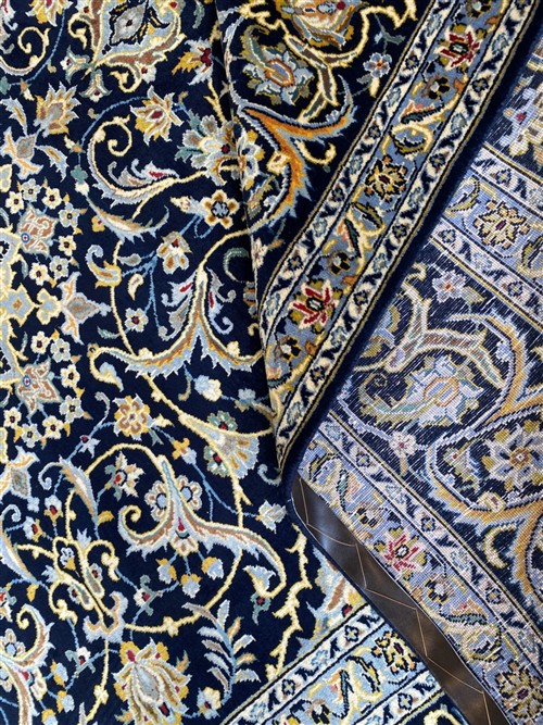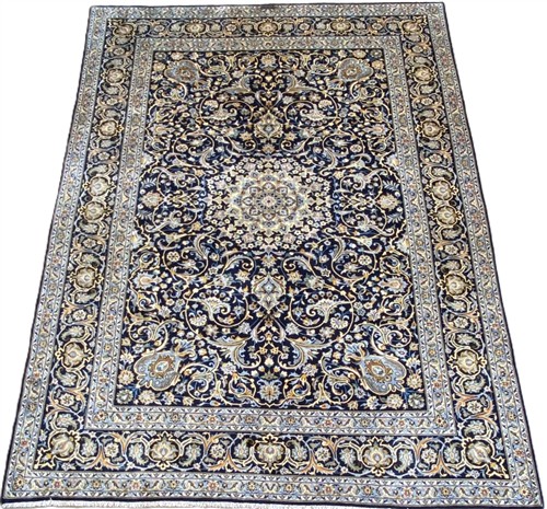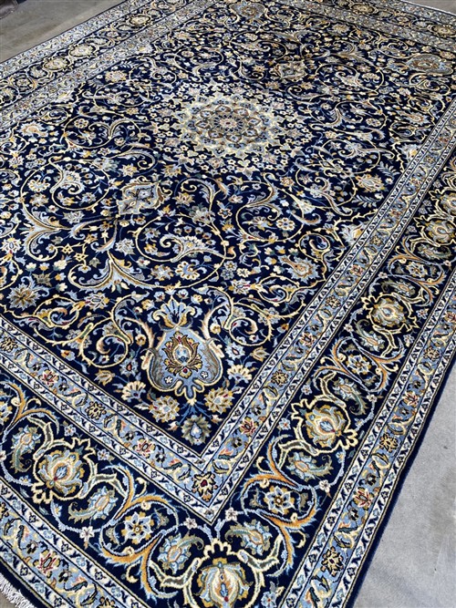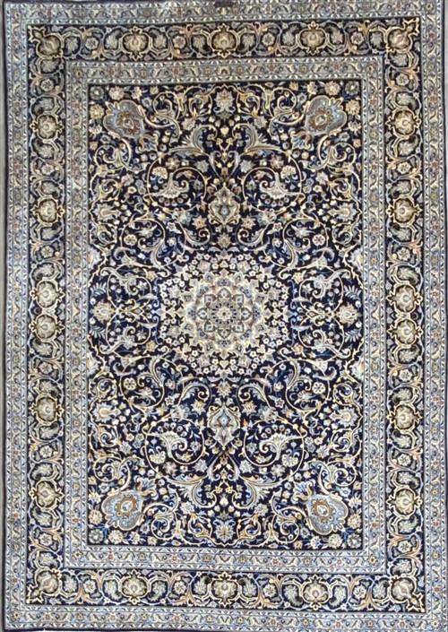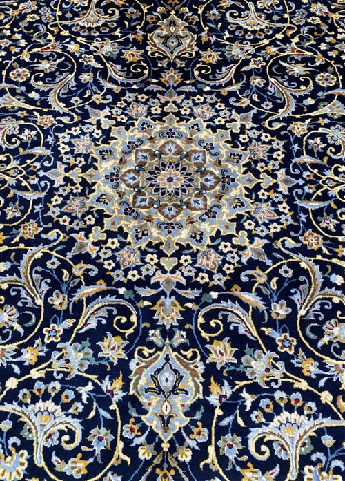 DENSE WOOL PILE. FINELY HAND-KNOTTED BY MASTER WEAVER "RABANI (SIGNED PIECE) FROM THE ISFAHAN PROVINCE WITH DESIGN OF A BOLD FLORAL MEDALLION IN A ROYAL PERSIAN BLUE FIELD OF PALMETTES, ARABESQUE SCROLLS, FLOWER HEADS & SAZ LEAVES. BORDER OF PALMETTES & SAZ LEAVES. THE ENTIRE IN SHADES OF ROYAL BLUE, CORNFLOWER BLUE & CREAM WITH GOLD HIGHLIGHTS.