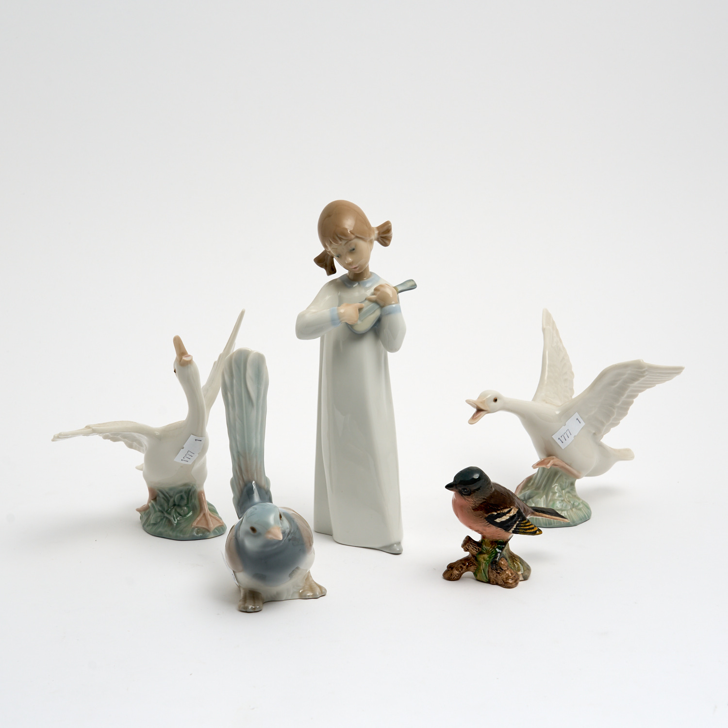 A GROUP OF LLADRO FIGURINES INCLUDING A GIRL, TWO GEESE AND A WAGTAIL, TOGETHER WITH A BESWICK CHAFFINCH (A/F) H.21CM (TALLEST)