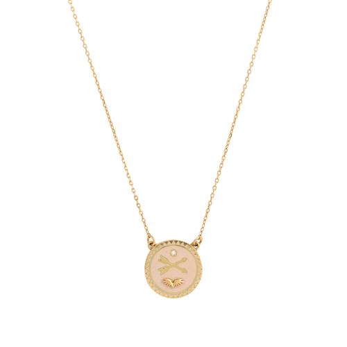 The circular pendant in pink and cream enamel, detailed with a single round brilliant-cut diamond, to an integral fine trace chain completed by a parrot clasp, signed Foundrae, pendant diameter 18mm, length 420mm, gross weight approximately 5.7 grams.