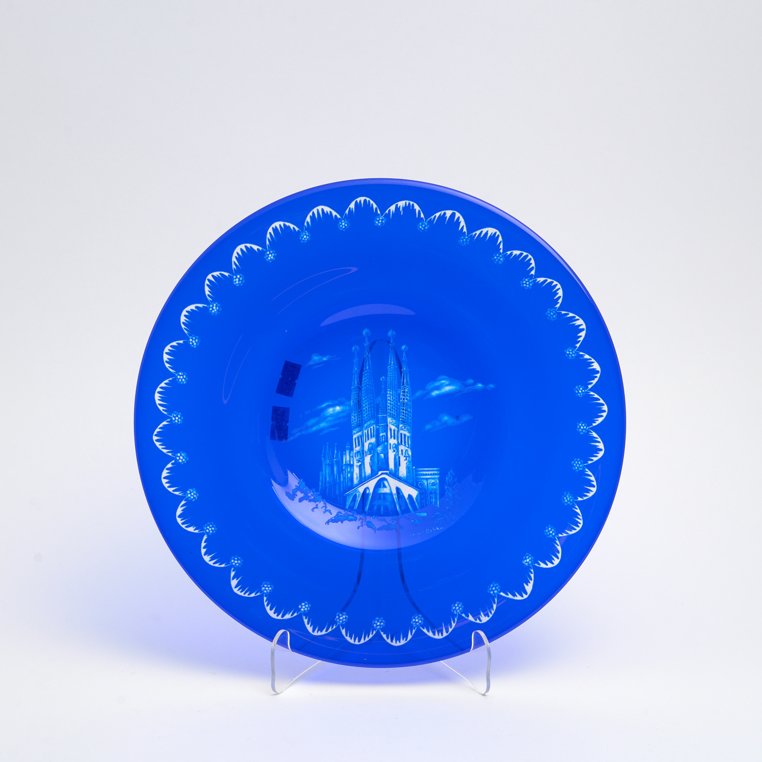 AN ETCHED GLASS PLATE DEPICTING SAGRADA FAMILIA BY ANNE DYBKA DIA.30.5CM