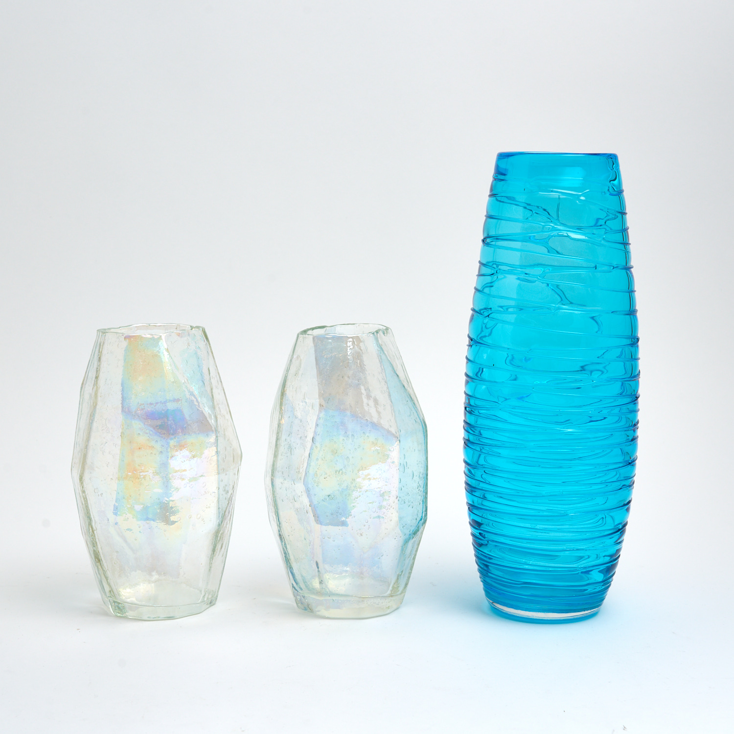 A PAIR OF IRIDESCENT GLASS VASES TOGETHER WITH A BLUE ART GLASS THREADED VASE IN BLUE H.35CM (TALLEST)