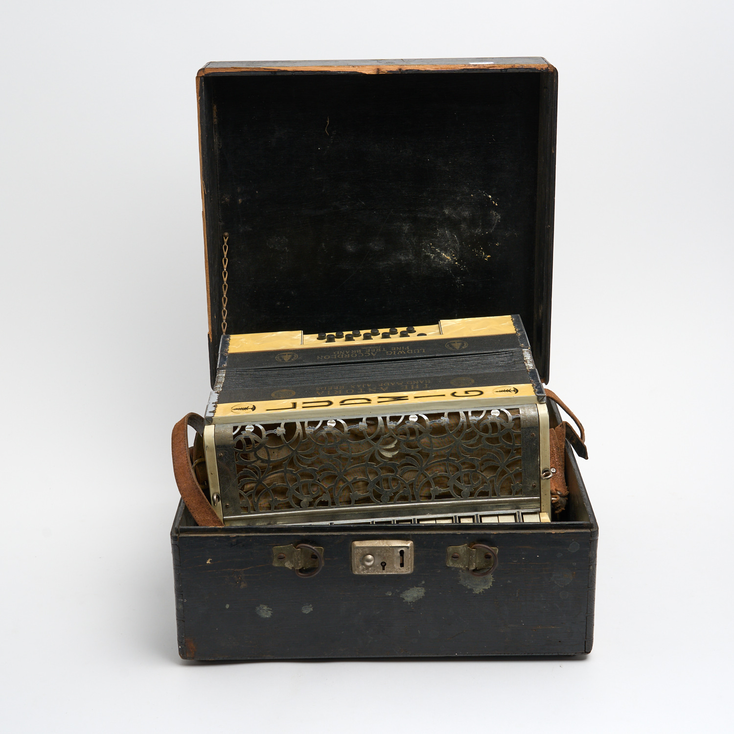 AN EARLY 20TH CENTURY CASED LUDWIG PIANO ACCORDION WITH MOTHER-OF-PEARL SHELL LOOK CASE L.32CM