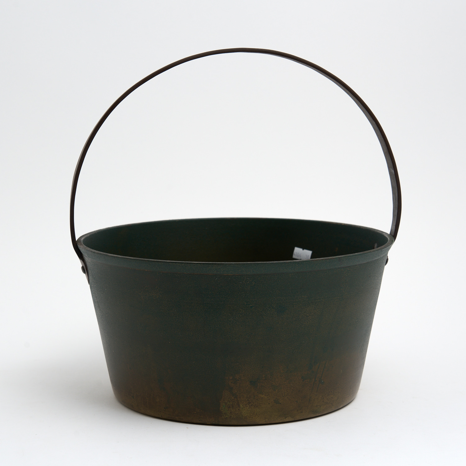 A HEAVY SOLID COPPER AND CAST IRON HANDLED PRESERVING PAN DIA.31CM