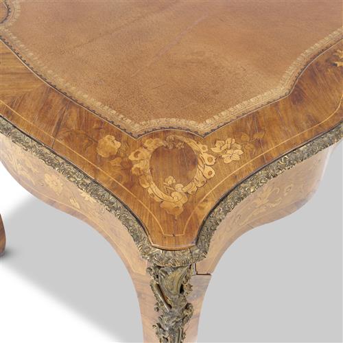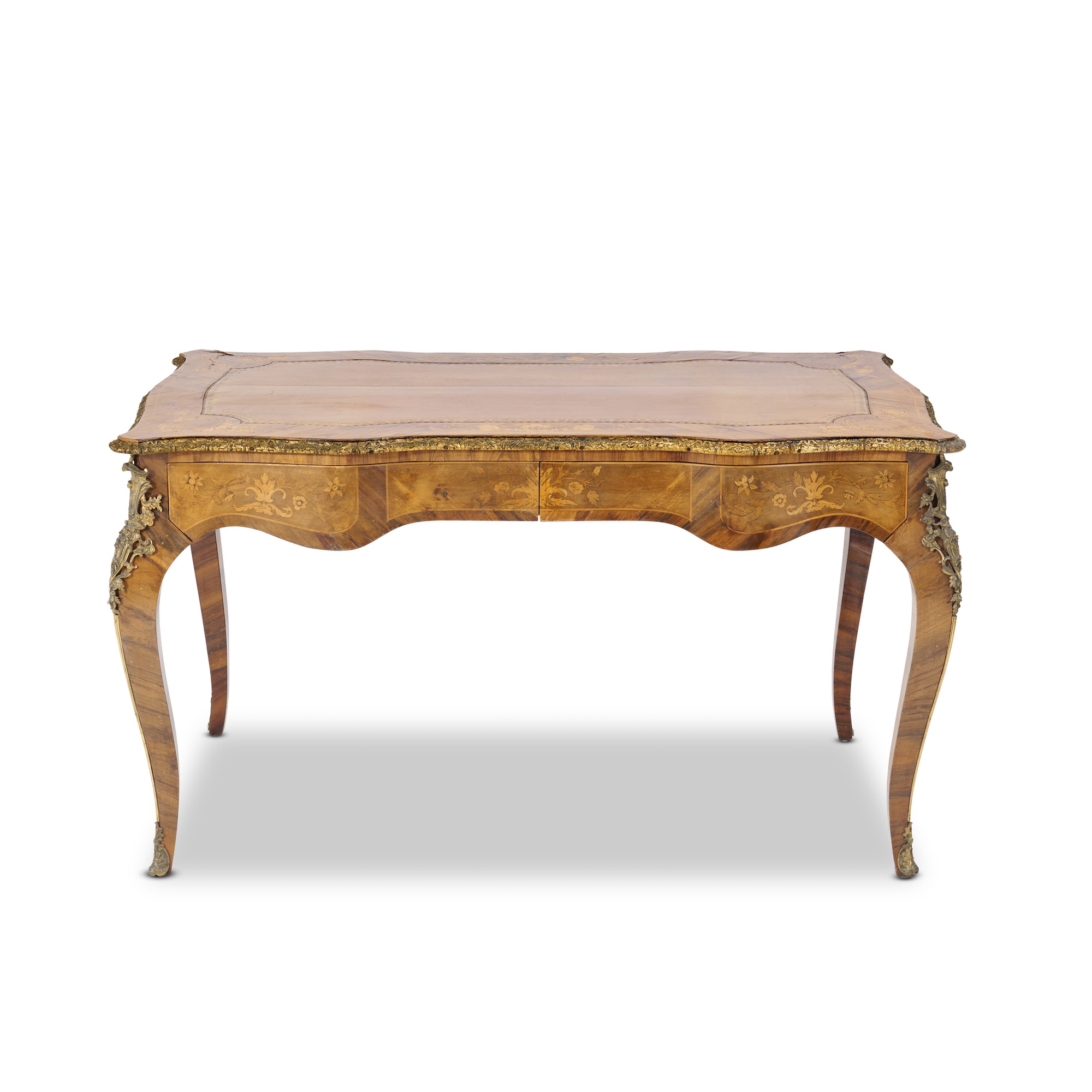 Of typical form, the shaped rectangular top with a gilt-tooled tan leather writing surface above a pair of frieze drawers to one long side, on square cabriole supports, the borders of the top and the friezes all round inlaid with floral marquetry, foliate bronze mouldings and mounts to the edges of the top and the supports