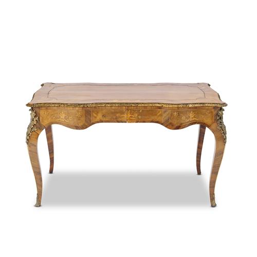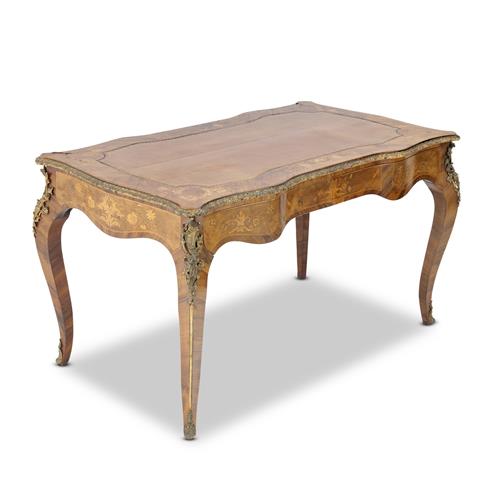 AN ANTIQUE LOUIS XV-STYLE BRONZE-MOUNTED KINGWOOD AND MARQUETRY BUREAU PLAT