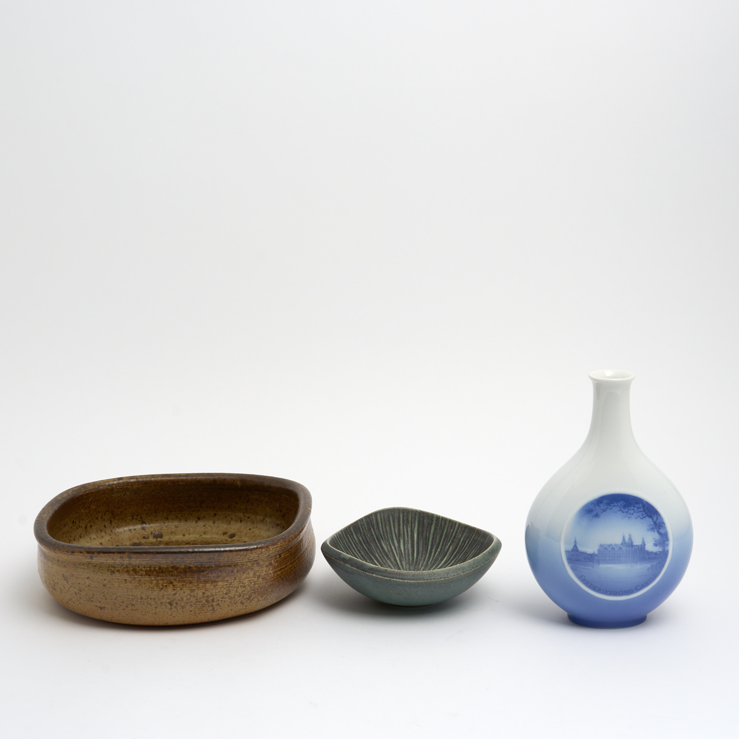 TWO MID-CENTURY DANISH SOHOLM STONEWARE BOWLS AND A ROYAL COPENHAGEN VASE H.21CM (TALLEST)
