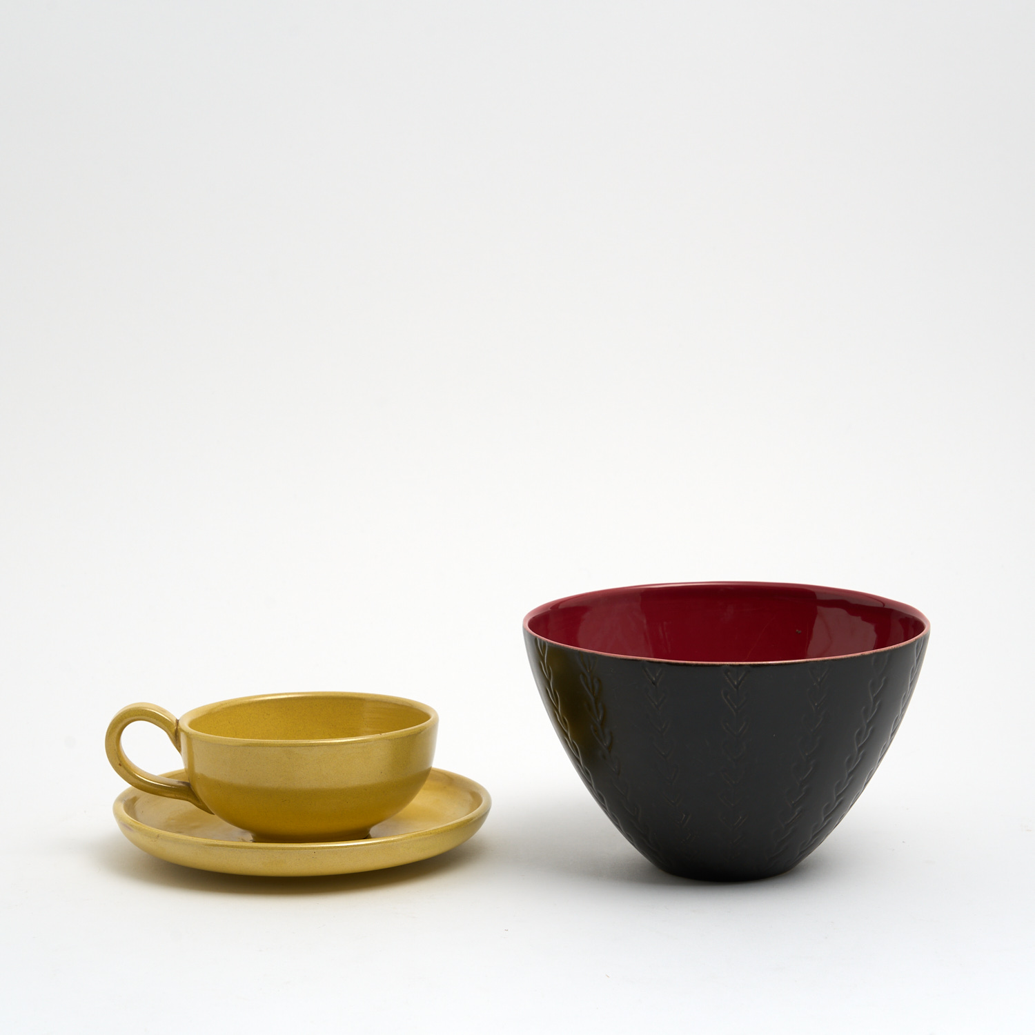 A SWEDISH POTTERY BOWL BY EVALD DAHLSKOG FOR BO FAJANS AND A CERAMIC CUP AND SAUCER BY JERK WERKMASTER FOR NITTSJO DIA.18CM