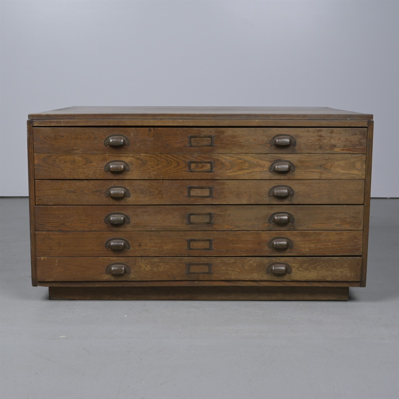 A MID-20th CENTURY OAK CHEST OF PLAN DRAWERS (66CM H X 117W X 92CM D) (THIS ITEM MUST BE REMOVED BY PROFESSIONAL CARRIERS OR CLIENTS. LEONARD JOEL STAFF CANNOT ASSIST WITH CARRYING OR DELIVERY OF THIS ITEM)