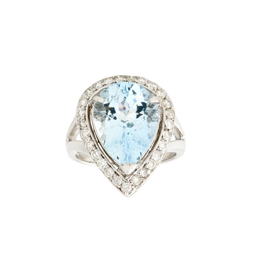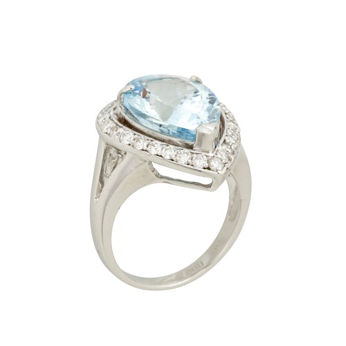 AN AQUAMARINE AND DIAMOND RING IN 18CT WHITE GOLD, THE AQUAMARINE WEIGHING APPROXIMATELY 6.20CTS, THE SURROUNDING DIAMONDS TOTALLING 0.70 CTS, SIZE N, TOTAL WEIGHT APPROXIMATELY 7.60 GMS