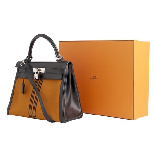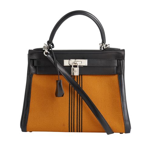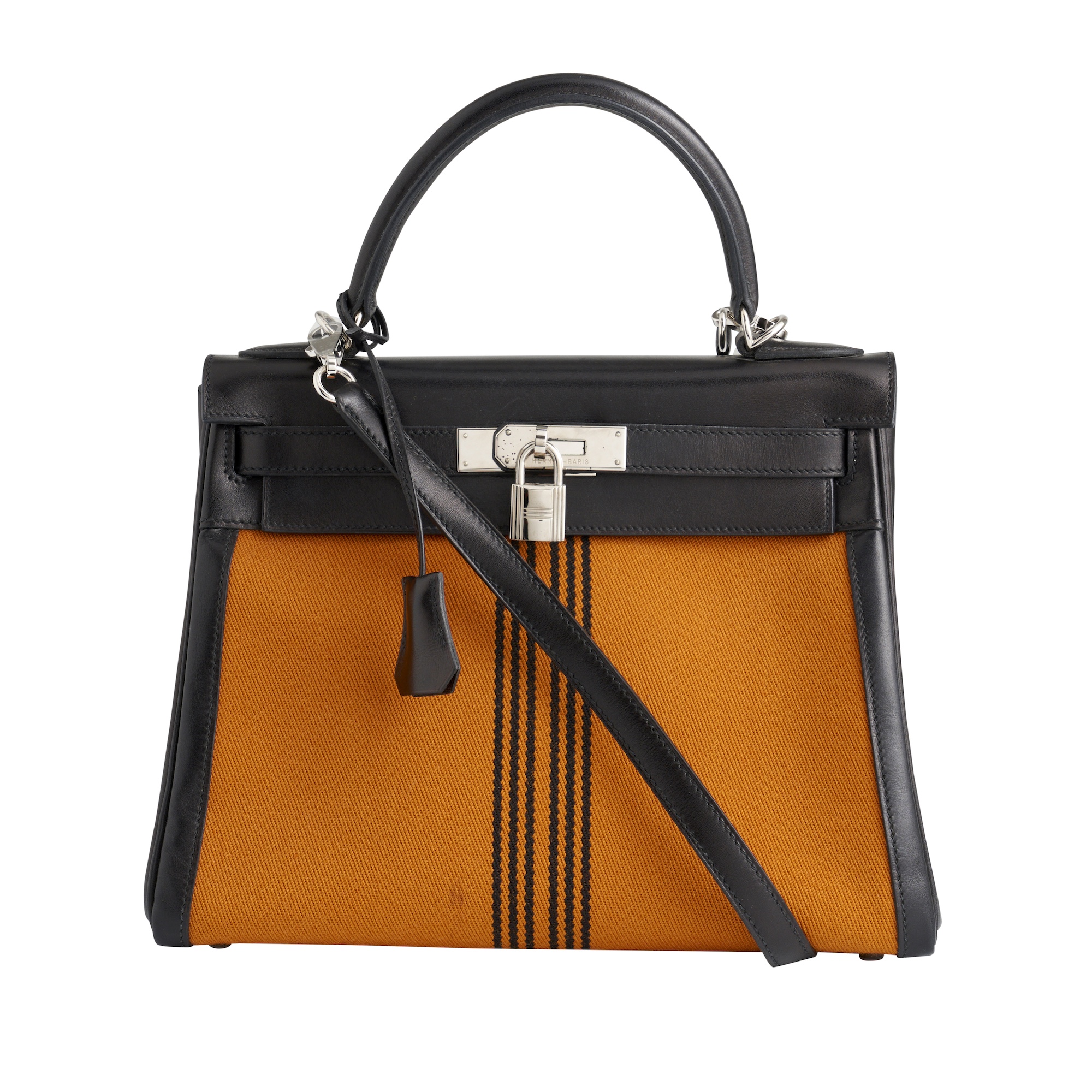 Styled in orange canvas featuring woven mirrored triple stripe detail with dark brown Box leather trim and silver tone hardware, measures 28 x 22 x 12 cm.