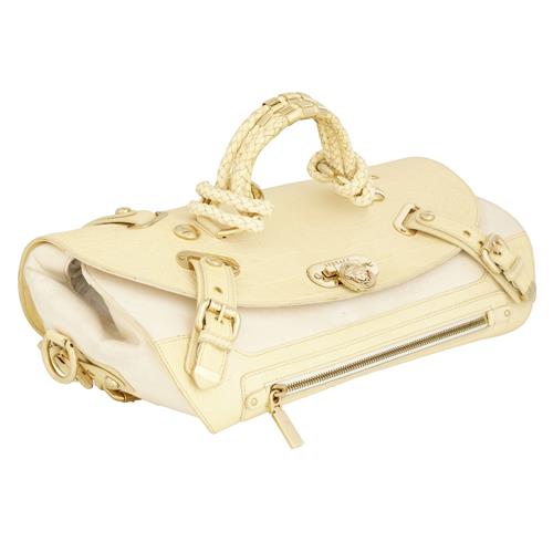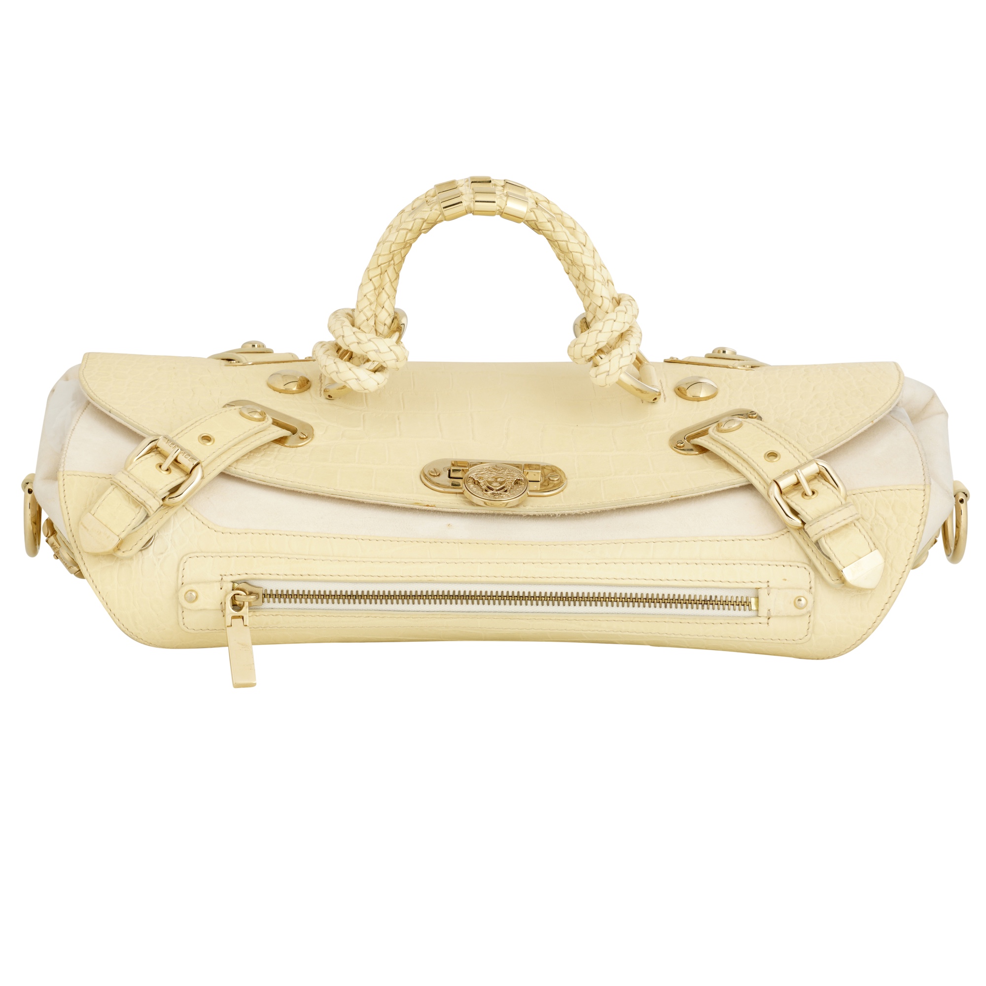 Styled in cream croc embossed leather and white suede with gold tone hardware, featuring buckle accents, braided handle and 'Medusa' logo closure, measures 41 x 14 x 25 cm.