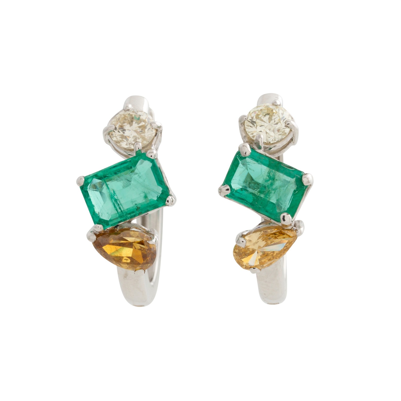 A PAIR OF EMERALD AND DIAMOND EARRINGS IN 18CT WHITE GOLD TO POST AND CLIP FITTINGS, THE EMERALDS TOGETHER WEIGHING APPROXIMATELY 2.30CTS, THE DIAMONDS 1.20CTS, LENGTH 20MM, TOTAL WEIGHT 4.0GMS