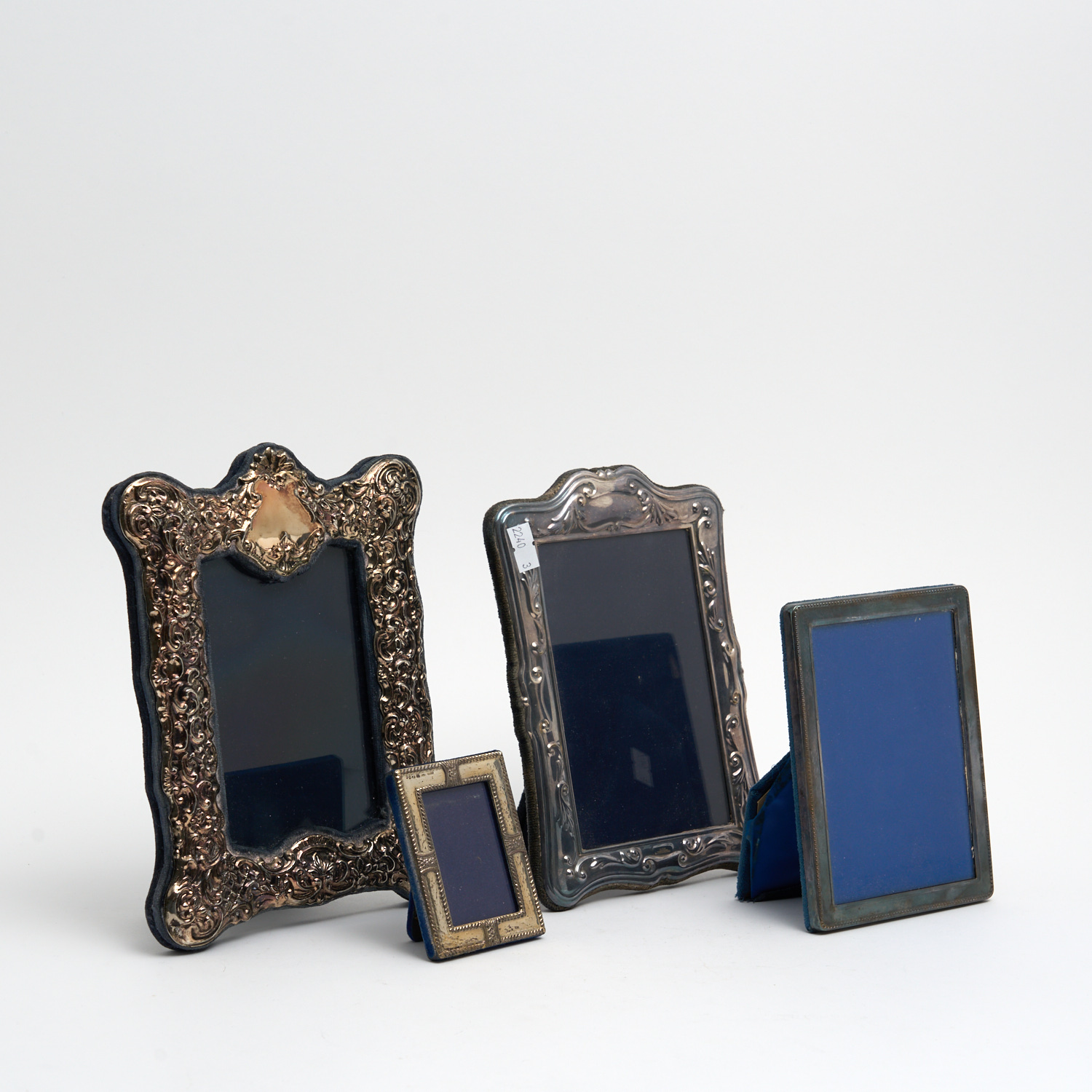 THREE SILVER PLATE PHOTO FRAMES TOGETHER WITH ONE SMALLER STERLING SILVER FRAME 22 X 17CM (LARGEST)