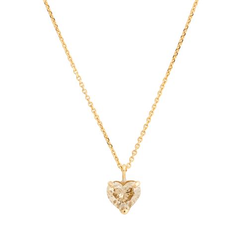 Featuring a claw-set heart-cut fancy yellow-brown diamond weighing approximately 1.06 carats, to a fine trace chain completed by a bolt ring clasp, length 410mm, gross weight approximately 2.00 grams.