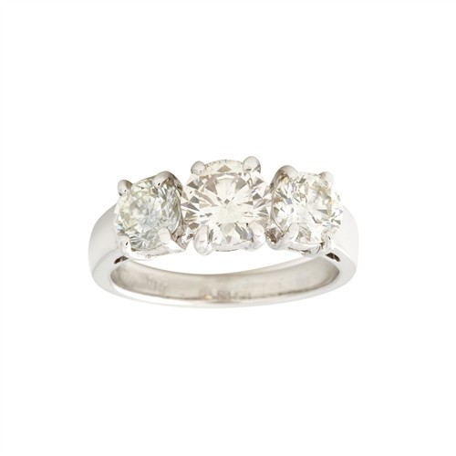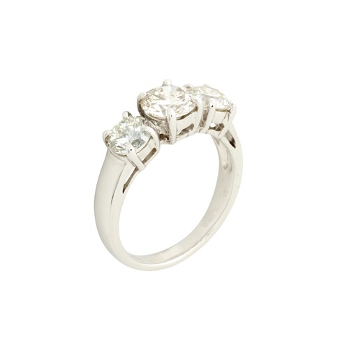 A BRILLIANT CUT DIAMOND TRILOGY RING IN 18CT WHITE GOLD, THE DIAMOND WEIGHT TOTALLING 2.27CT, SIZE L 1/2, TOTAL WEIGHT 4.6GMS