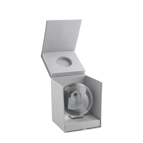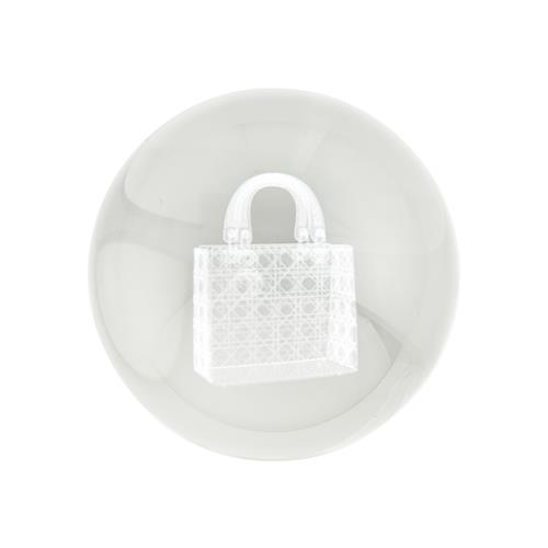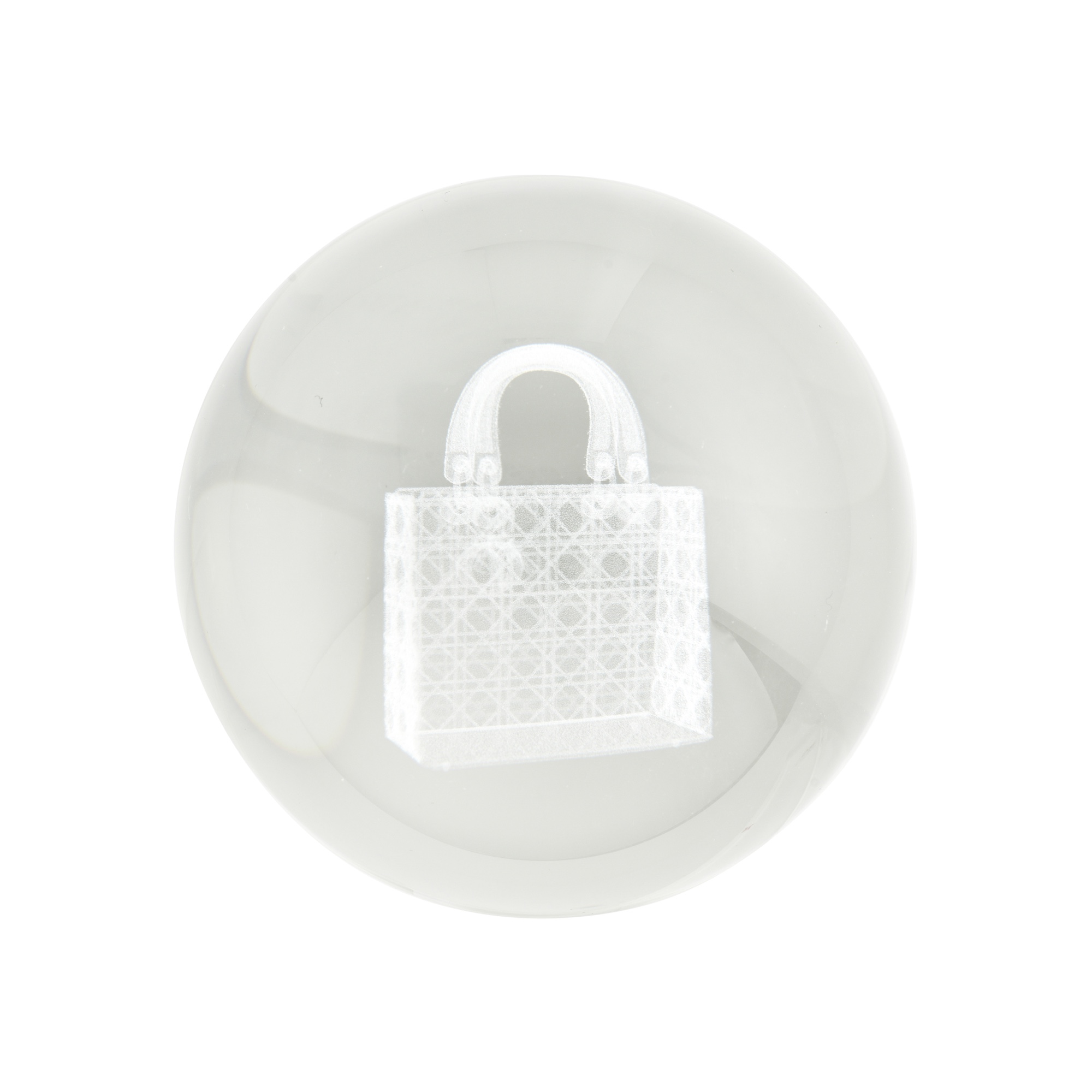 Comprising a solid glass orb with laser engraved Lady Dior purse feature and sculpted glass base, measures 32 cm in circumference.