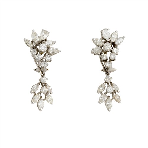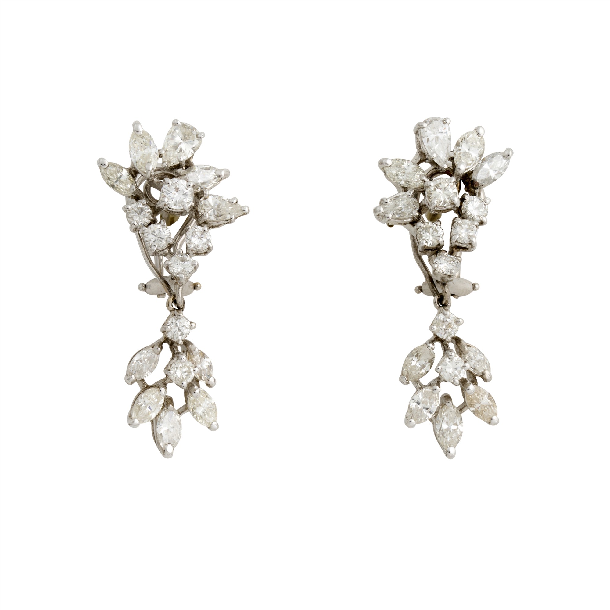 Vintage diamond cluster drop, each centring a round brilliant-cut diamond surrounded by marquise-cut to a post and clip with a detachable fitting comprising a mix of a round brilliant-cut diamonds, pear-cut and marquise-cut diamonds, the diamonds together weighing approximately 4.20 carats, length of earring approximately 20mm, length of drop approximately 23mm, width approximately 20mm, gross weight approximately 7.8 grams.