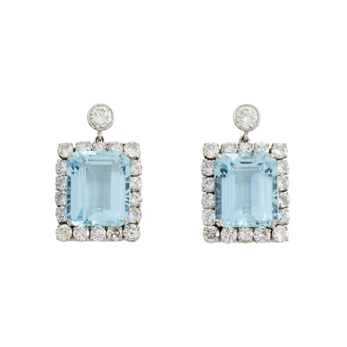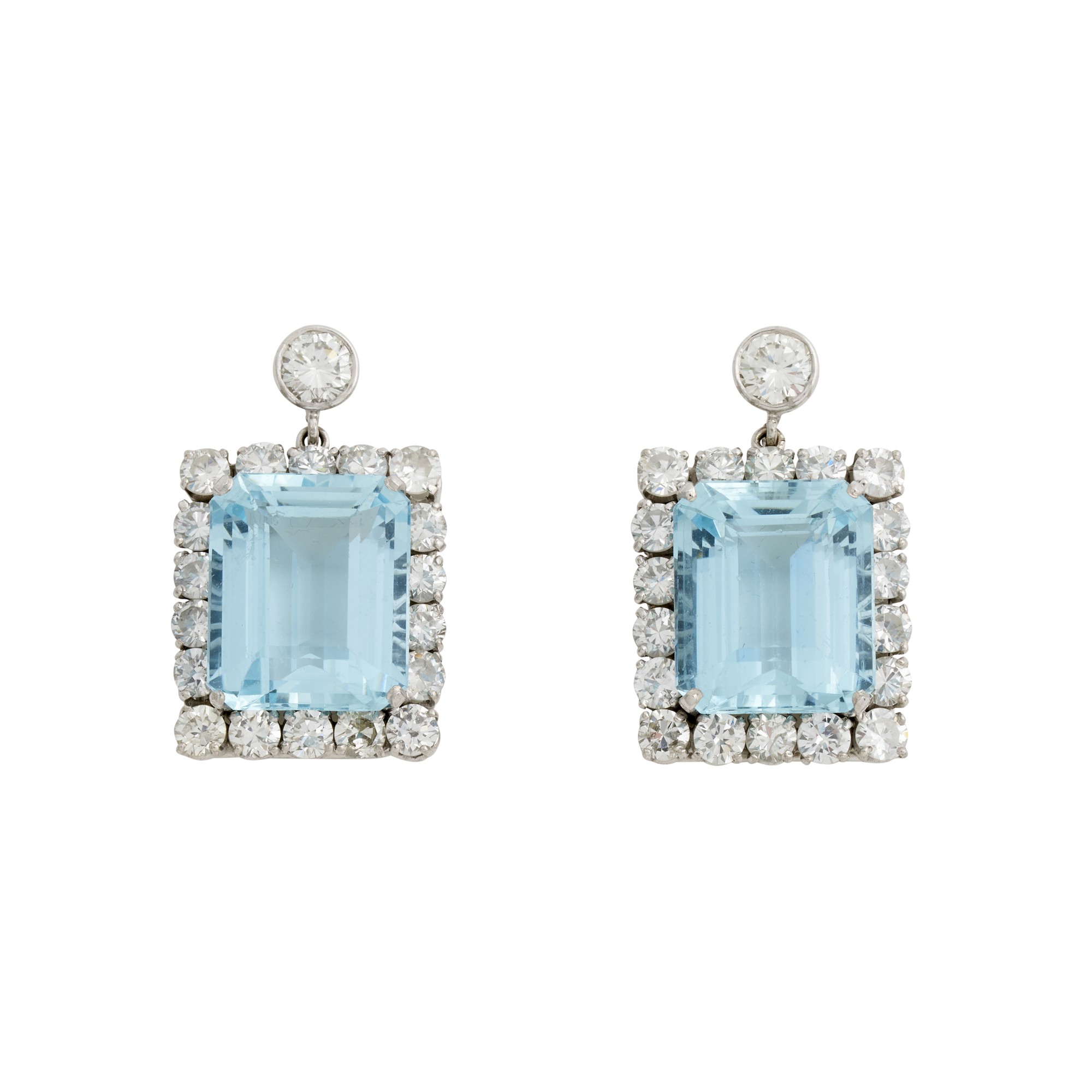 Each comprising a bezel-set diamond with an articulated drop of emerald-cut aquamarines surrounded by eighteen claw-set diamonds to a post with a thread screw fitting, the diamonds together weighing approximately 4.15 carats, length of drops 22mm, width 20mm, gross weight approximately 14.6 grams.