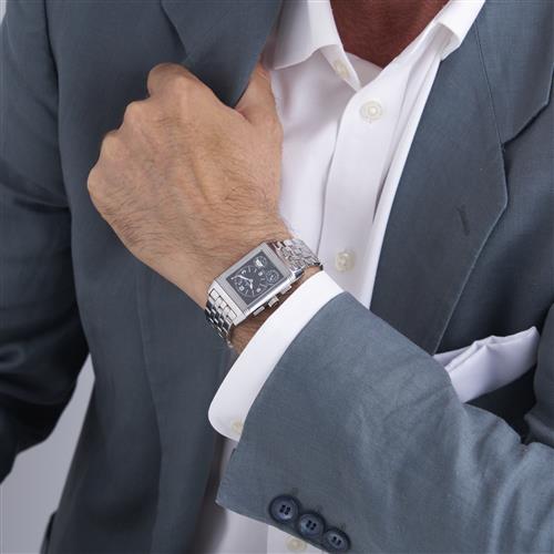 Case: brushed and polished reversible rectangular, reeded ends, crown flanked by twin pushers for dual time dial hour setting, no. 2222221