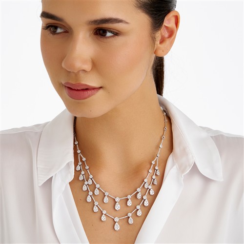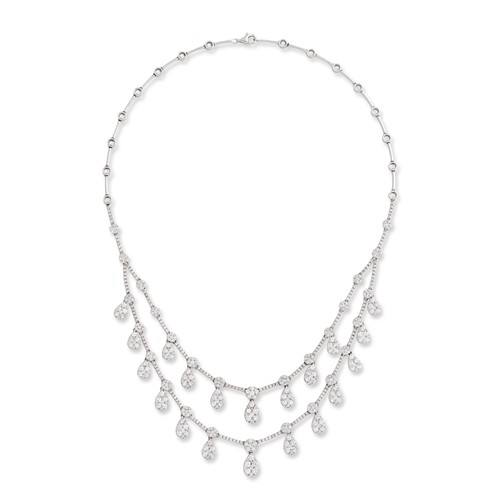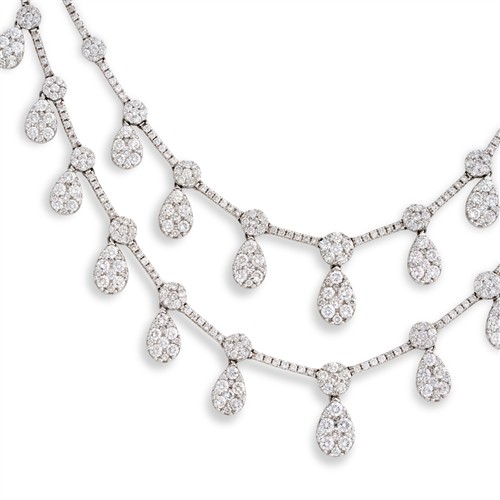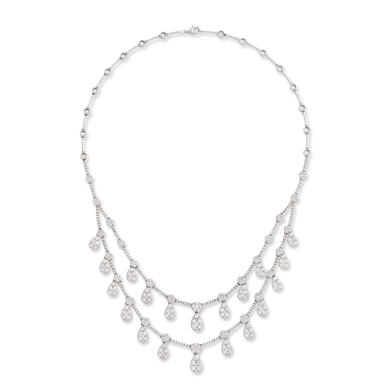 Composed as two lines of pear-shaped cluster swing drops, pavé-set with brilliant-cut diamonds, between similarly set bar connectors, the diamonds together weighing approximately 8.90 carats, mounted in 18ct white gold, inner circumference 440mm, gross weight approximately 36.3 grams.