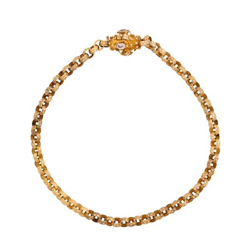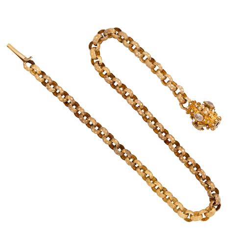 Designed as a belcher chain of finely detailed textured links with star motifs, completed by a cannetille accented clasp set with oval-cut pink topaz and embellished with foliate detail, length approximately 350mm, gross weight approximately 22.9 grams.