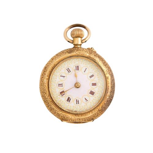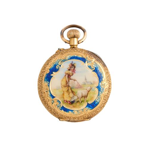 A LADY'S 18CT GOLD AND ENAMEL OPENFACE POCKETWATCH CIRCA 1900