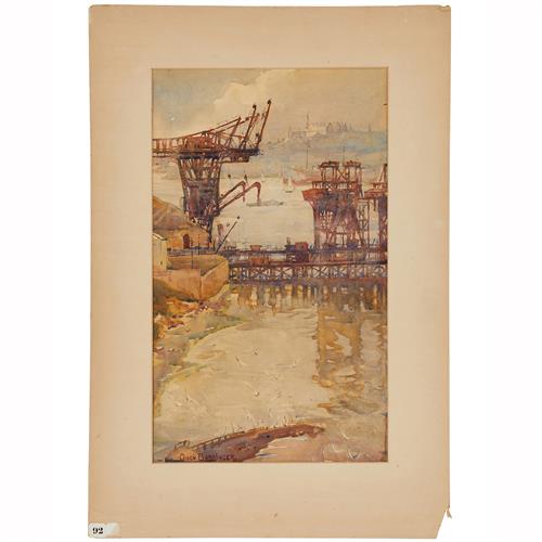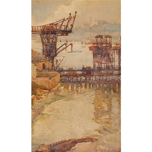 GWEN BARRINGER (1882-1960) Construction of a Bridge, Sydney - Cranes at Milsons Point watercolour on paper 39 x 44.5cm (58 x 64cm f...